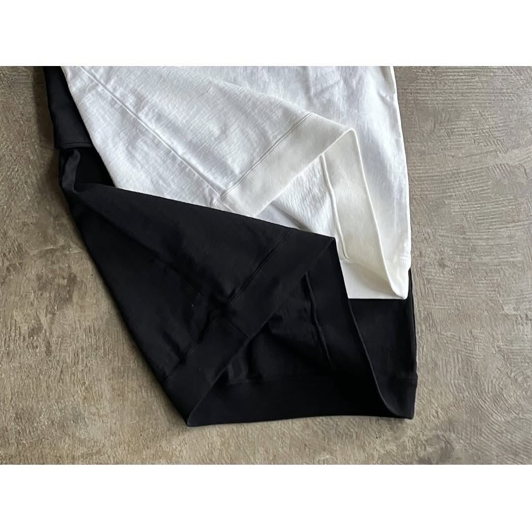 透けない、身体のラインがわかりにくい、汗染みが目立ちにくいといった見栄えの安心感に加え、リブの締まりによってふくらみのある半袖スウエットのようなフォルムになり、生地と肌の間に隙間が生まれることから春から夏にかけて快適に着用できるように、丁寧に作り込みがなされています。