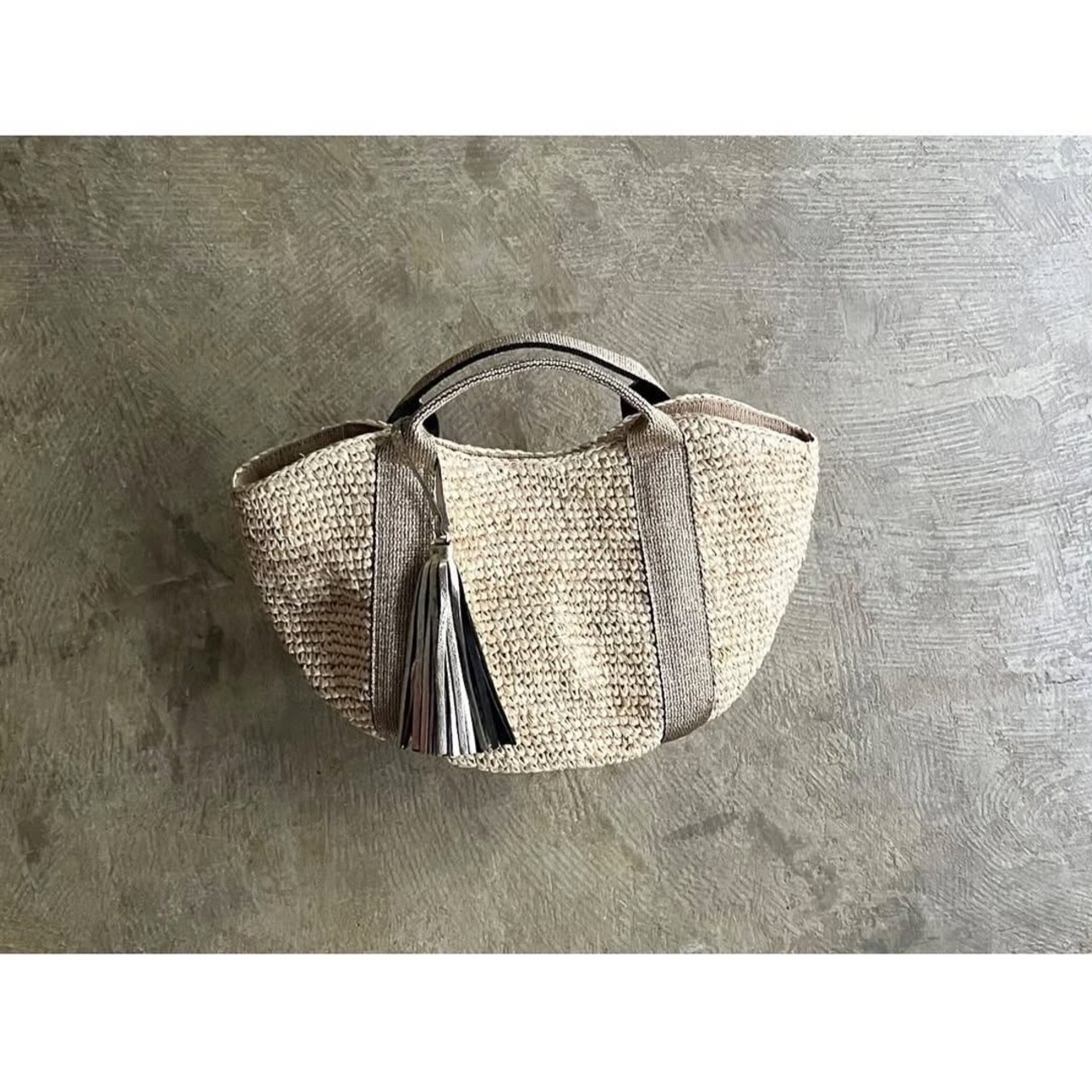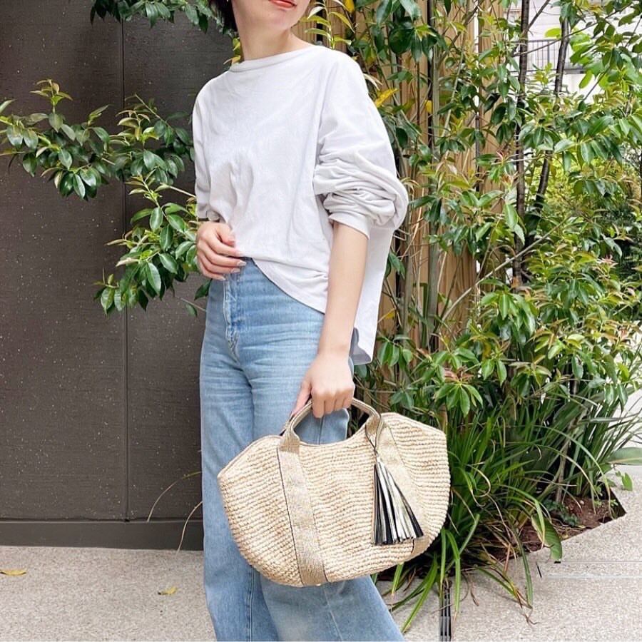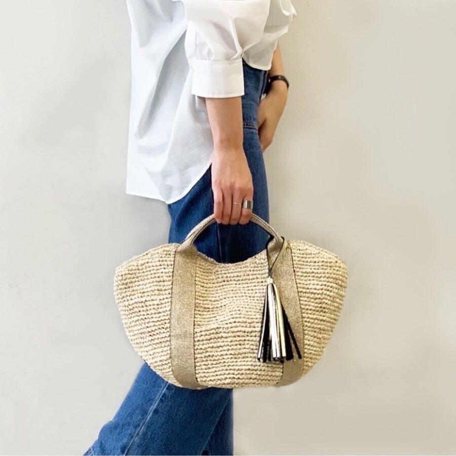 テープ素材のハンドルと上品に揺れるタッセルが、天然素材ならではのカジュアル感にフェミニンな印象を添えるアクセントに。