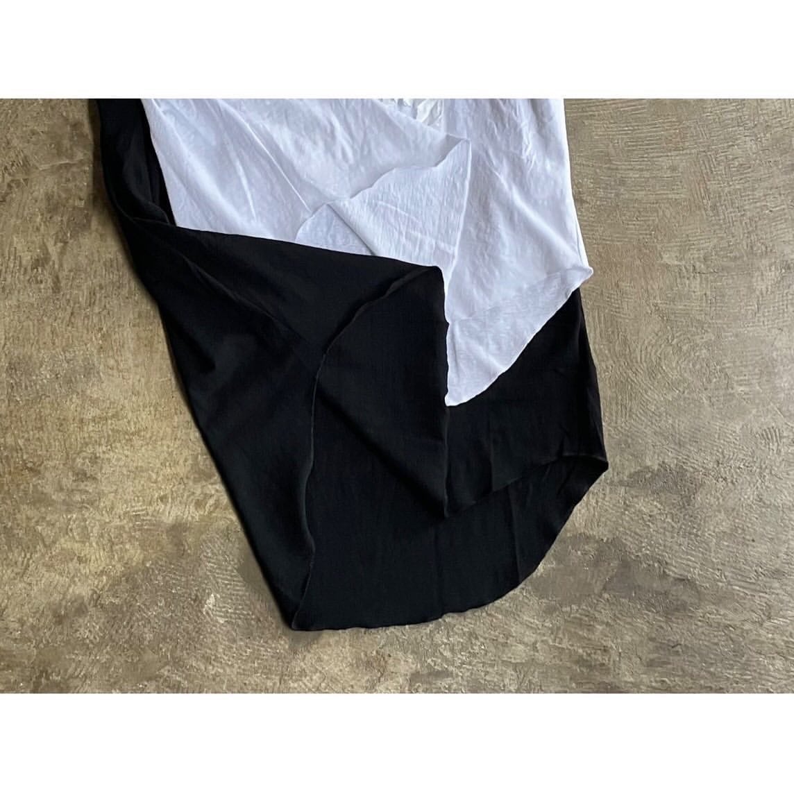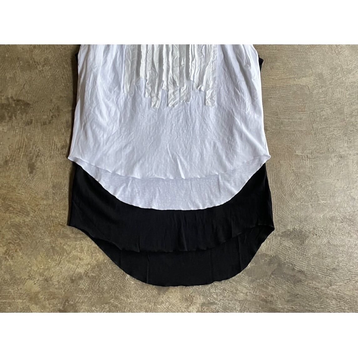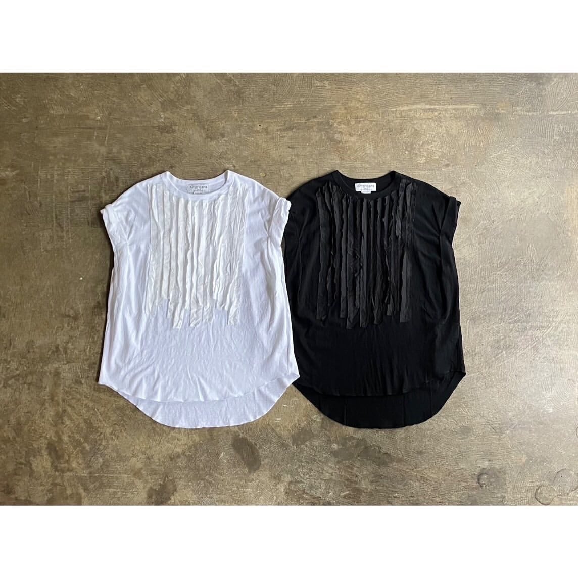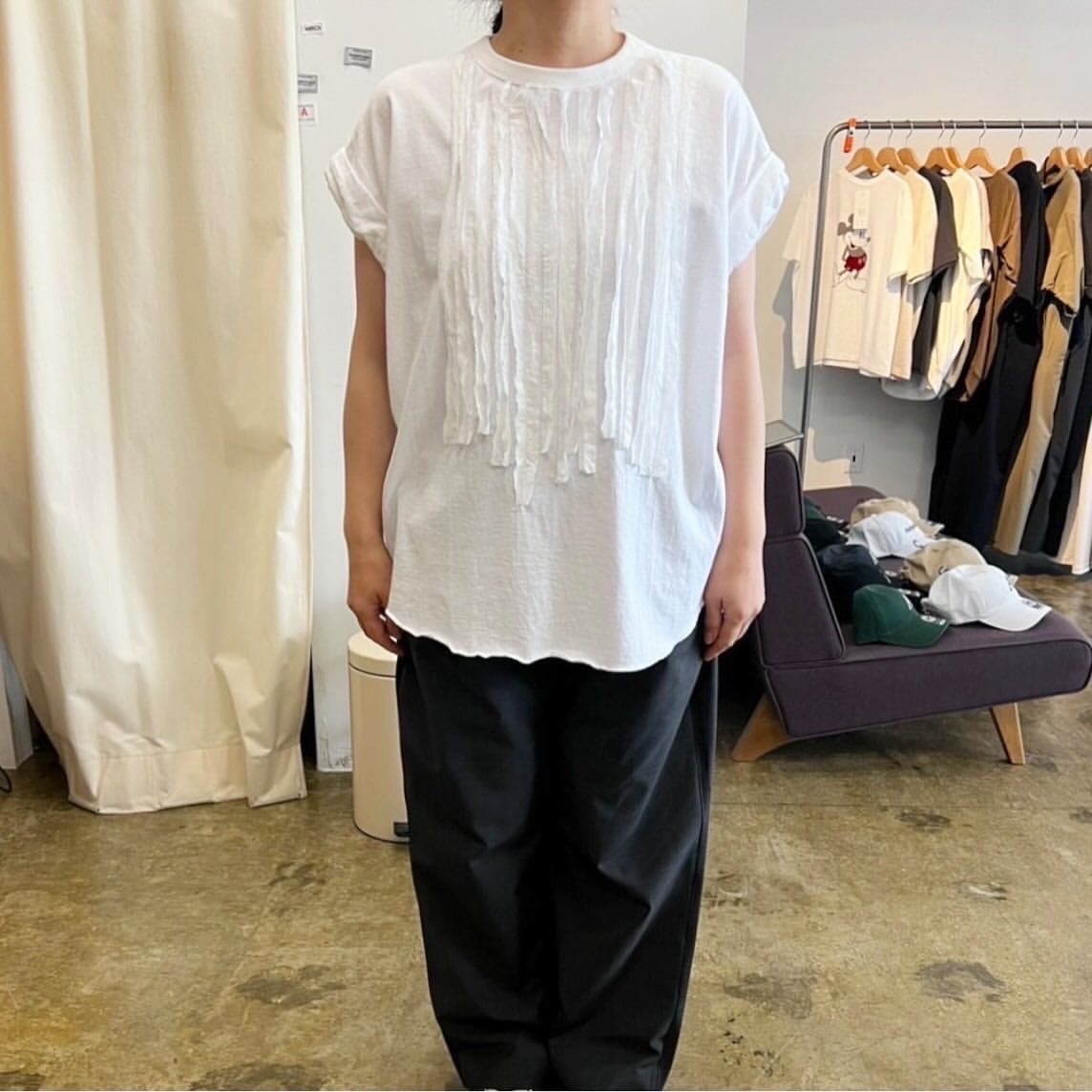 ・この製品はTシャツを手作業でデコレーション、リメイクしています。リメイクの風合いを活かすためにデコレーション部分は裁ち切り仕様になっております。