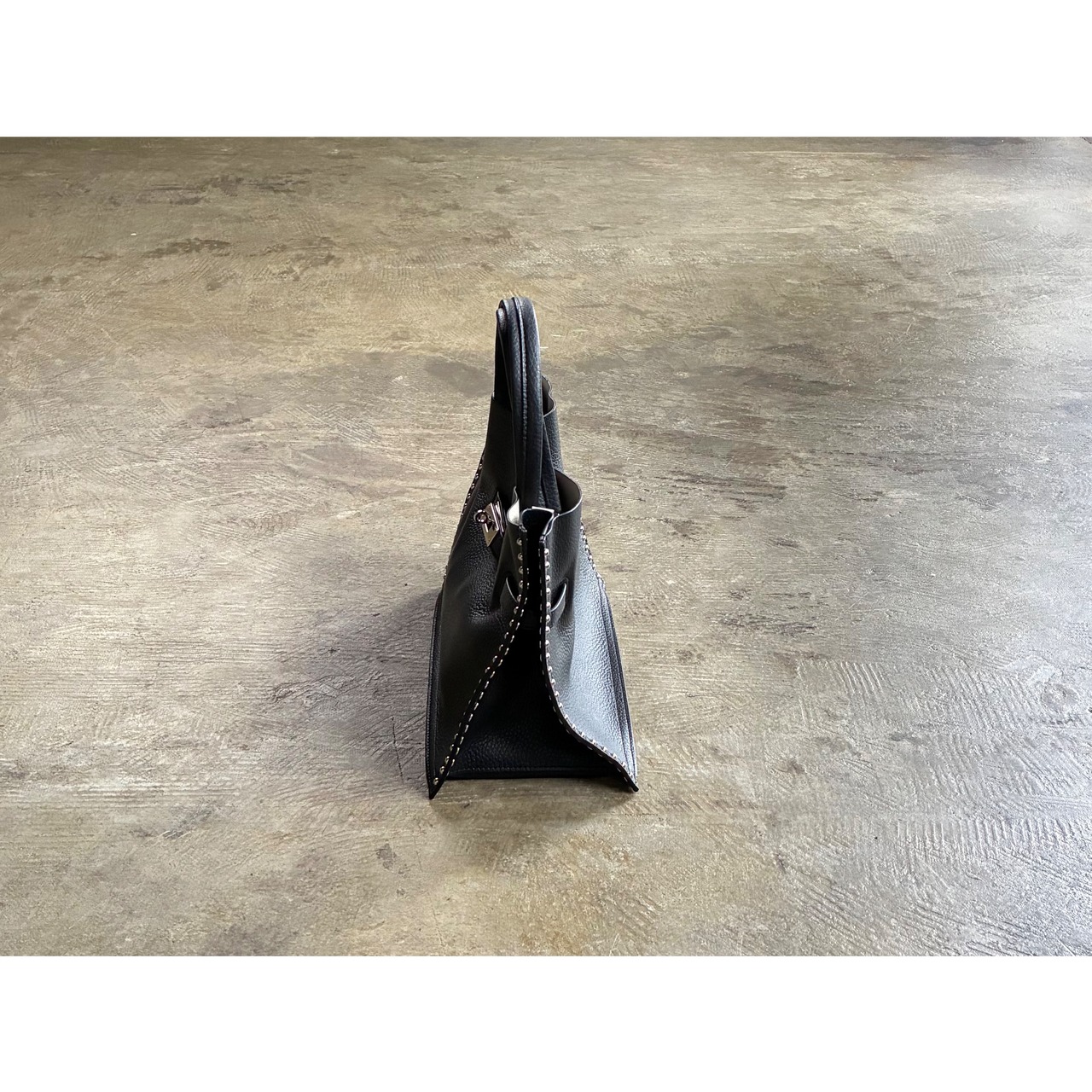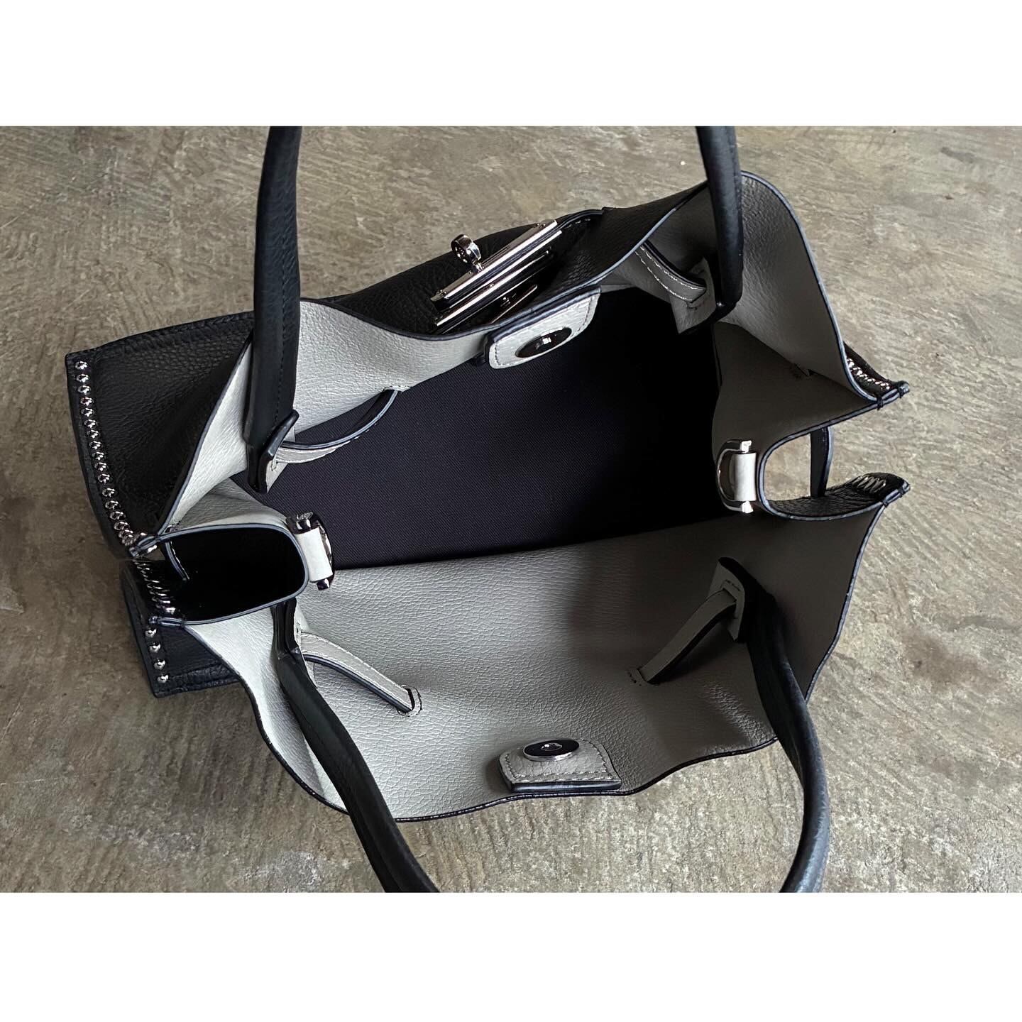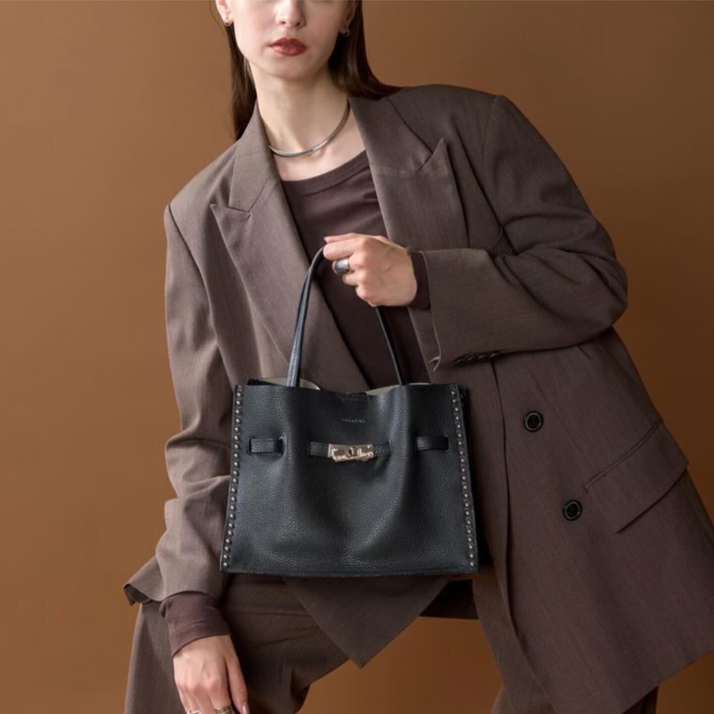 バッグのデザインは、サイドラインに施されたスタッズと、シルバーのターンロックをリンクさせたデザインがポイント。