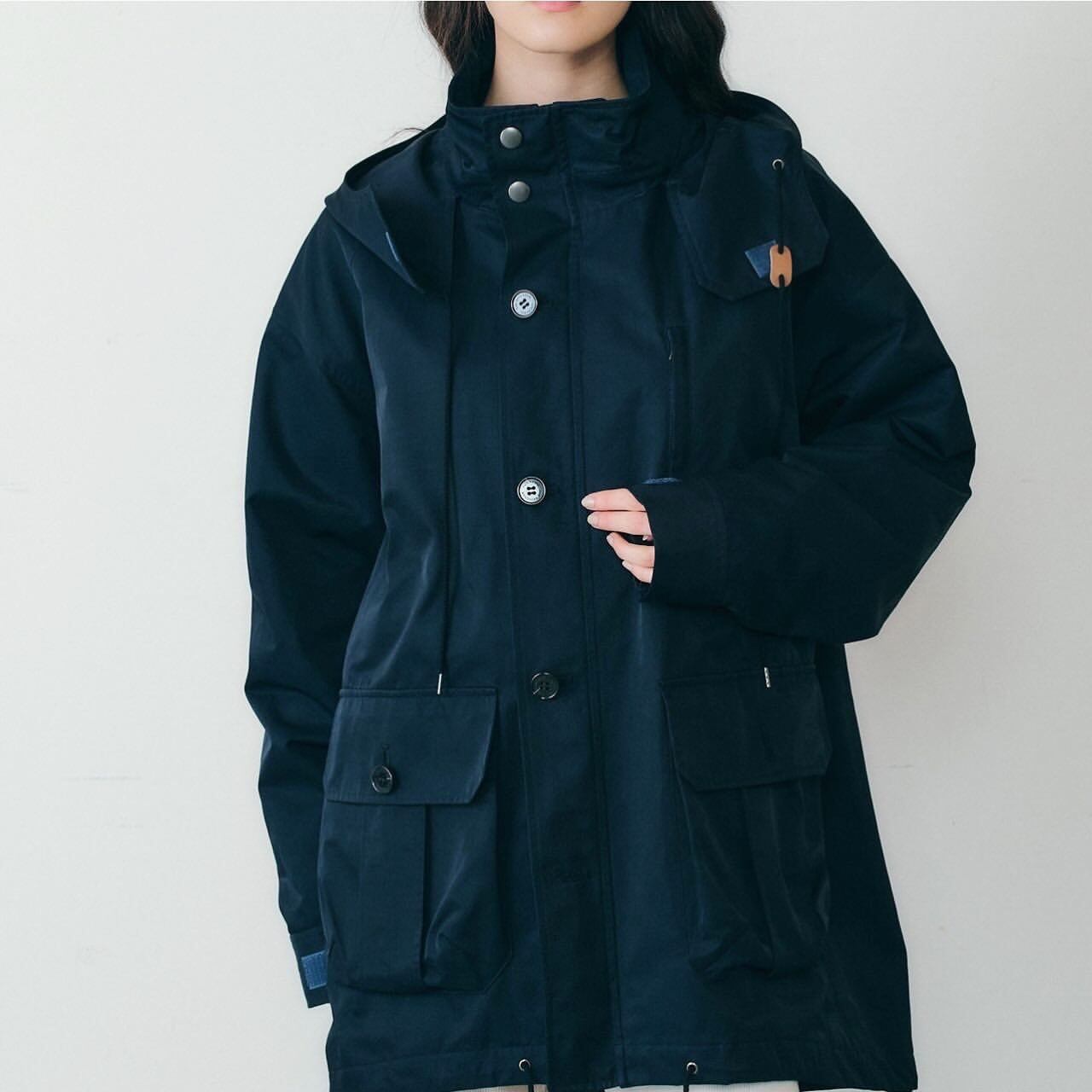 スタンドカラーの襟には取り外し可能なフードを備え、気分やスタイリングに合わせて表情を変えられるのも魅力です。