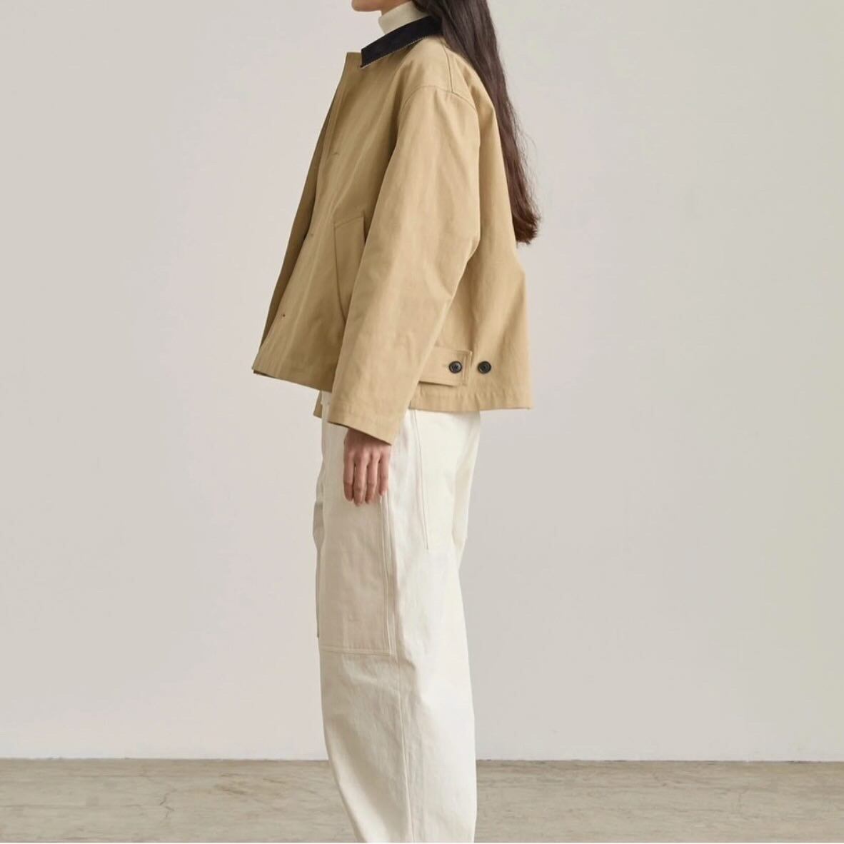 衿のコーデュロイ切替やボタンの大きさ、バックスタイルの裾アジャスター、ステッチワークなど、シンプルながら細部にまでこだわりを感じるデザインに仕上げています。