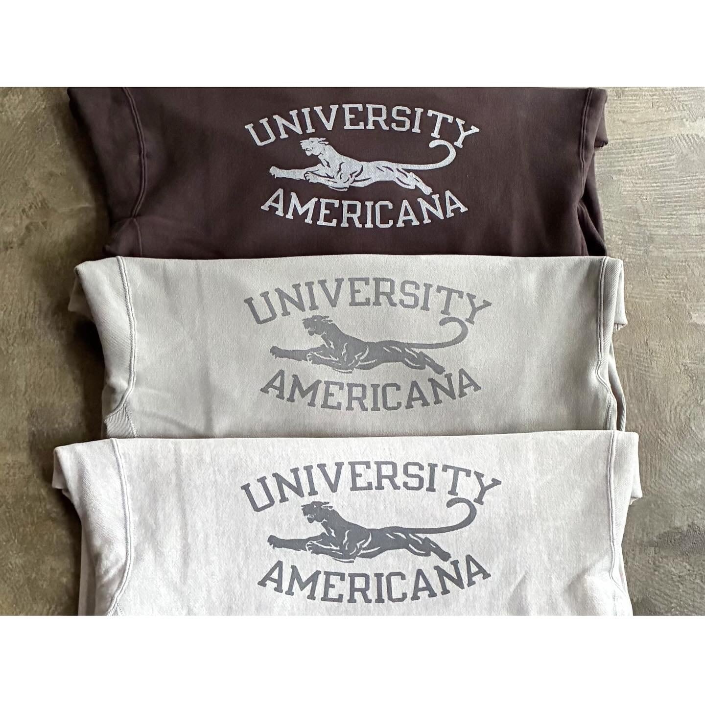 プリントのデザインは、「UNIVERSITY AMERICANA」のロゴを用いて、"AMERICANA"オリジナルのカレッジプリントデザインを染み込みプリントにて施しています。