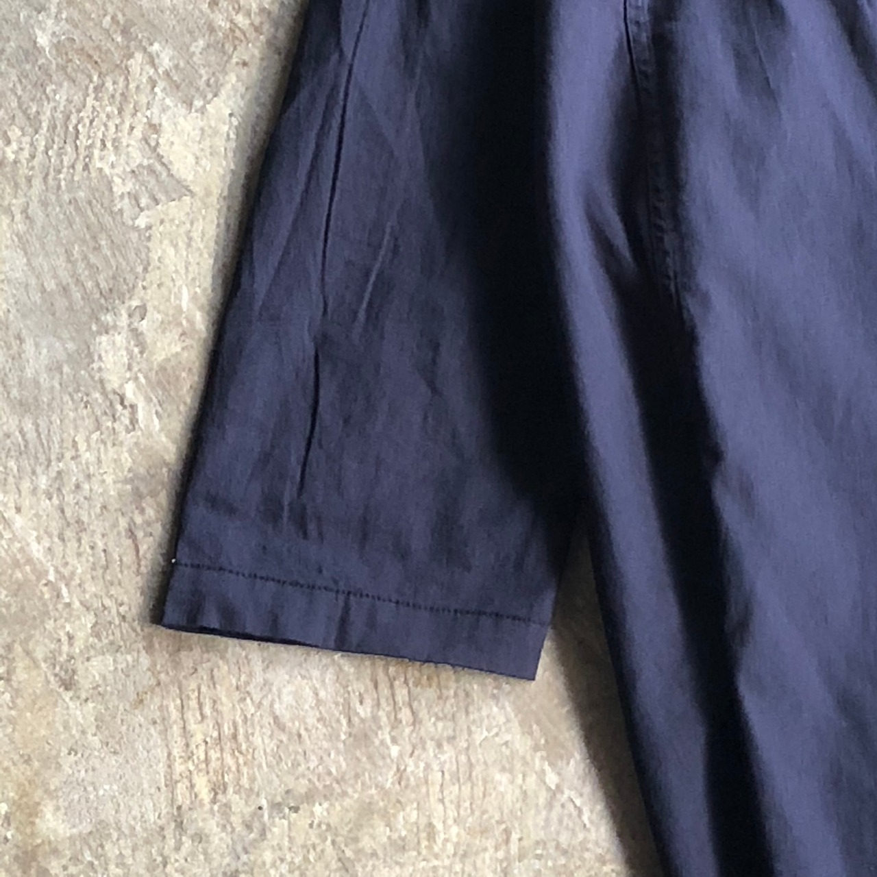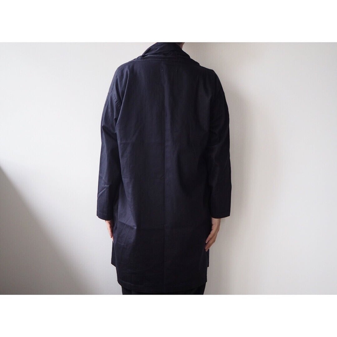 デザインはたっぷりと幅広にとった前開きの打ち合わせに、両脇にポケットを配したシンプルなデザイン。
