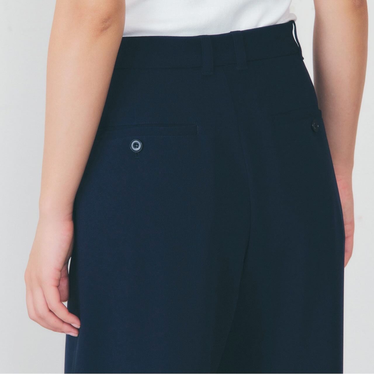 カーブの効いたフォルムに、素材の美しい落ち感が加わることで、見た目以上に穿きやすく、快適な着用感に仕上がっています。