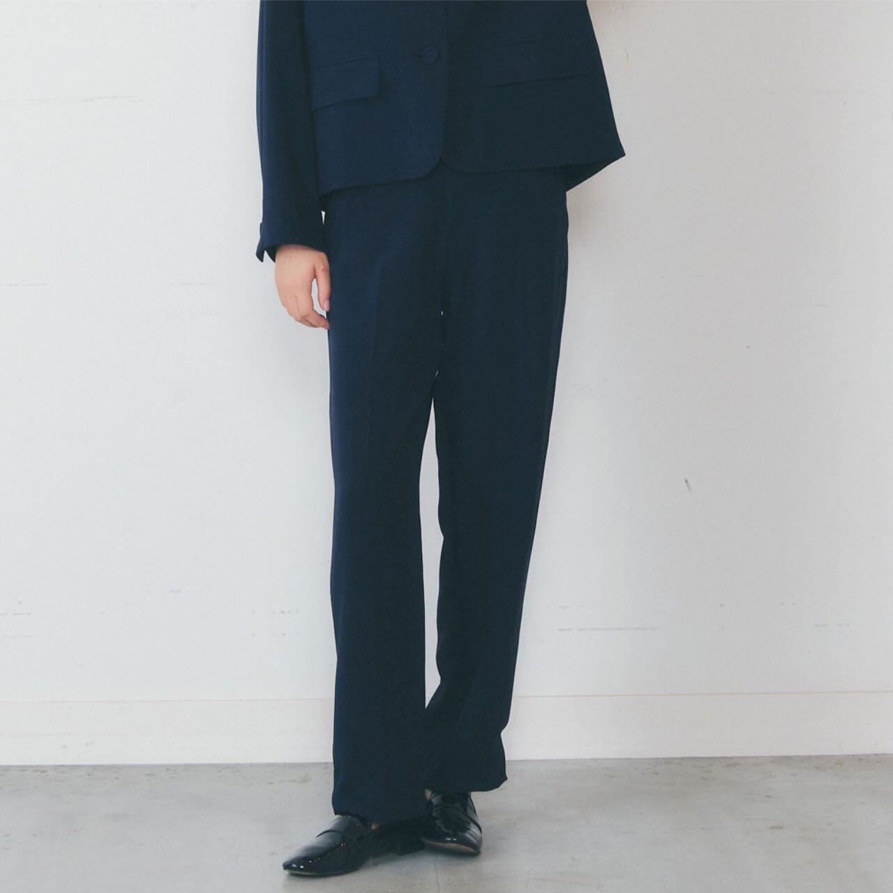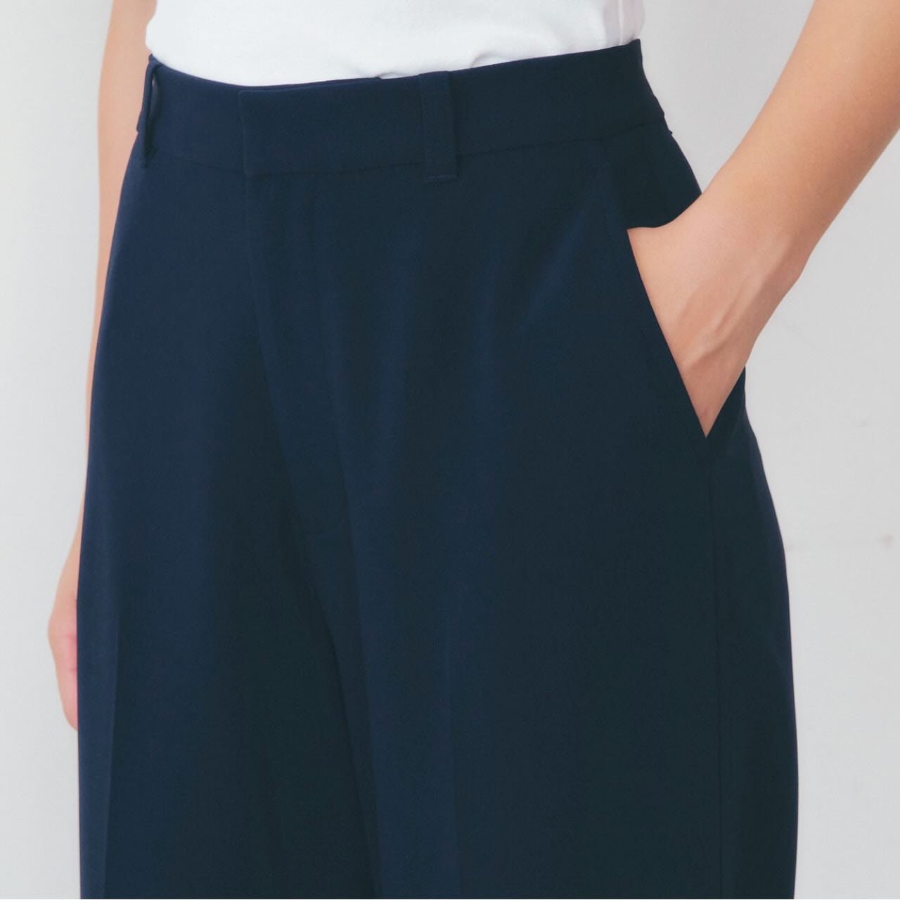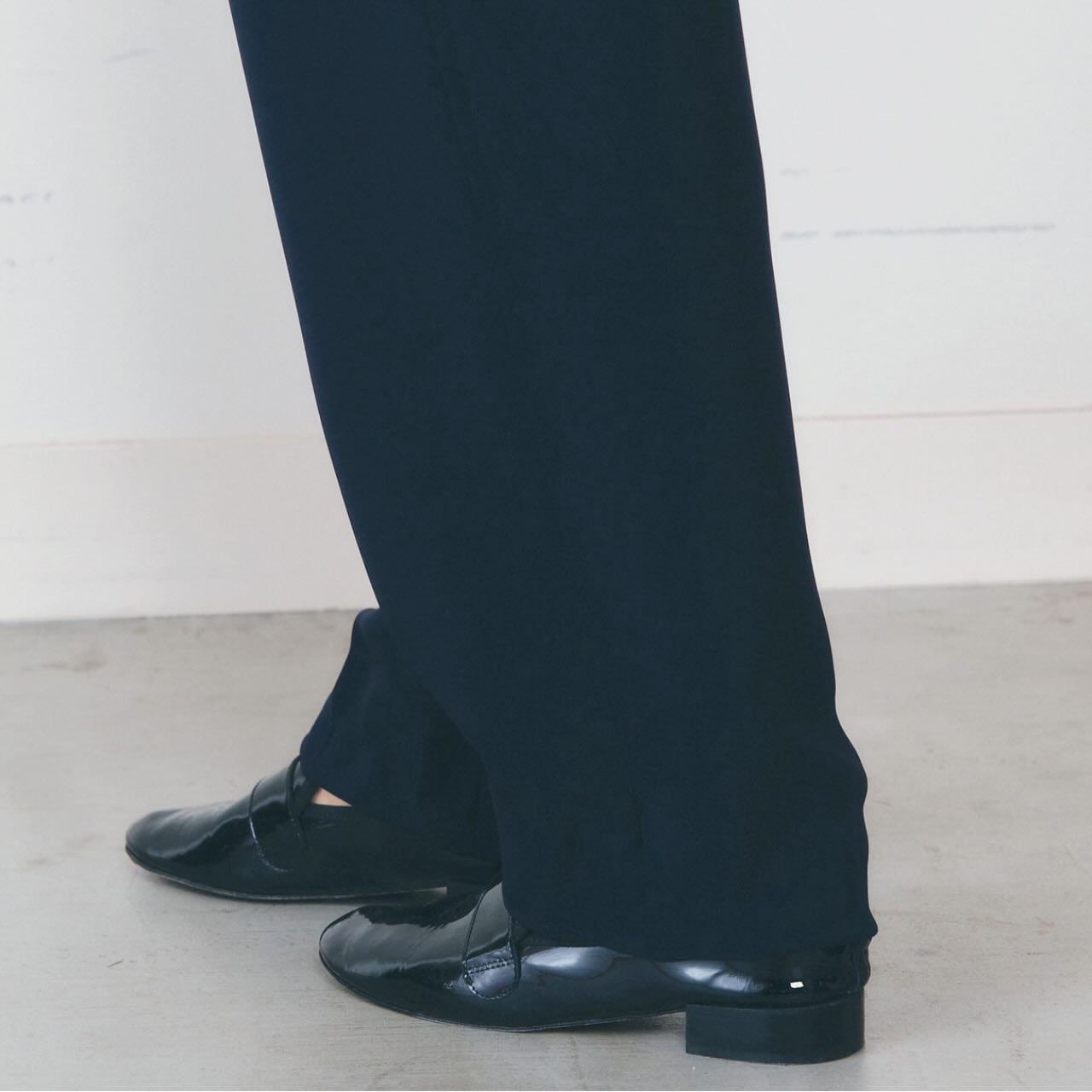 二重織ならではのふっくらとした厚みを持ちながらも、落ち感はとても美しく、脚のラインを拾いすぎないのも魅力。