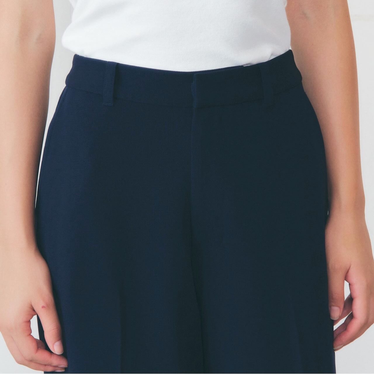 本作では、太ももまわりにゆとりを持たせつつ、膝から裾にかけてすっきりとしたラインを描くことで、体のラインを拾いすぎず、女性らしい柔らかさと体型カバーを両立。