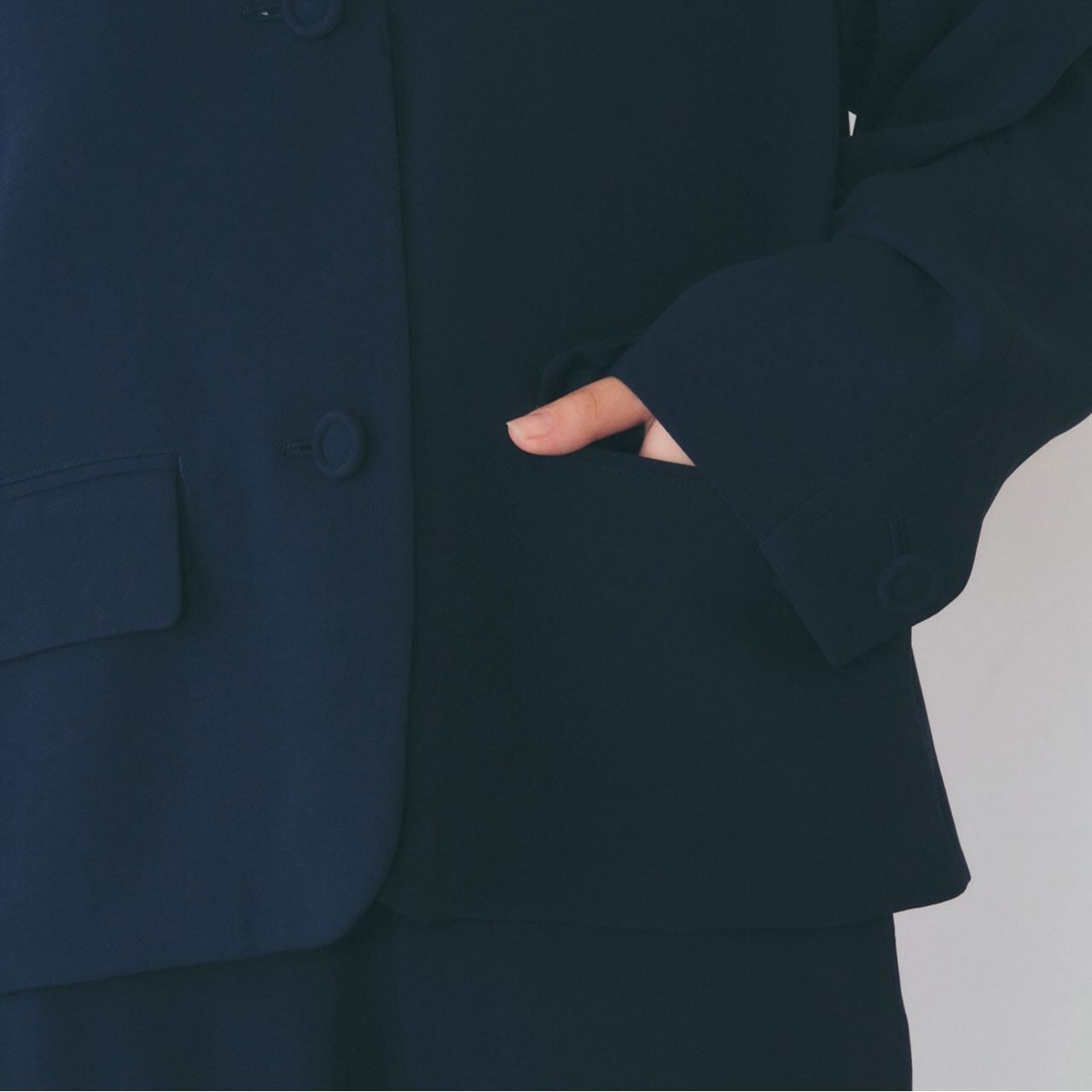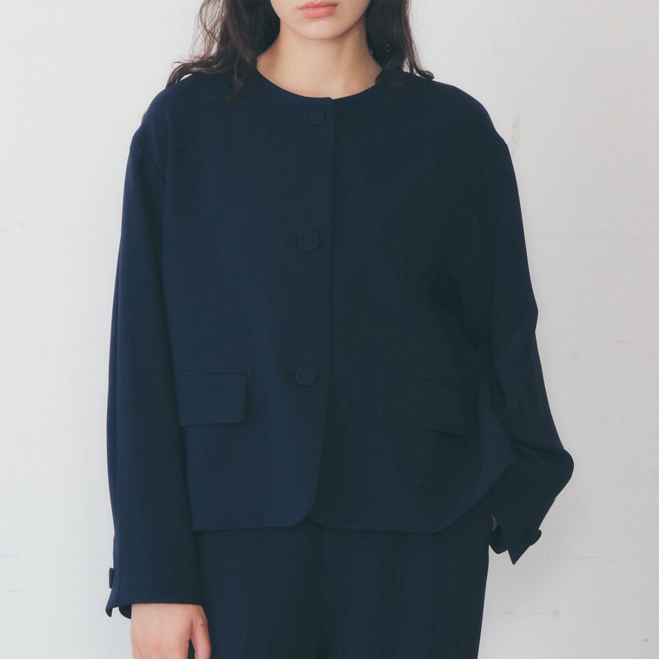 デザインは、シンプルで汎用性の高いノーカラータイプのジャケット。