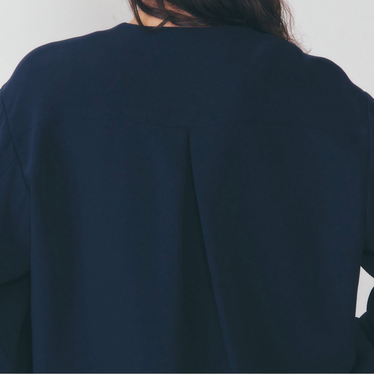 首まわりをすっきりと見せるミニマルなラインで、インナーを選ばずさっと羽織れる、使い勝手の良いデザインで仕立て上げています。