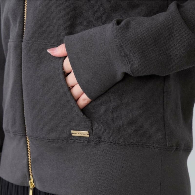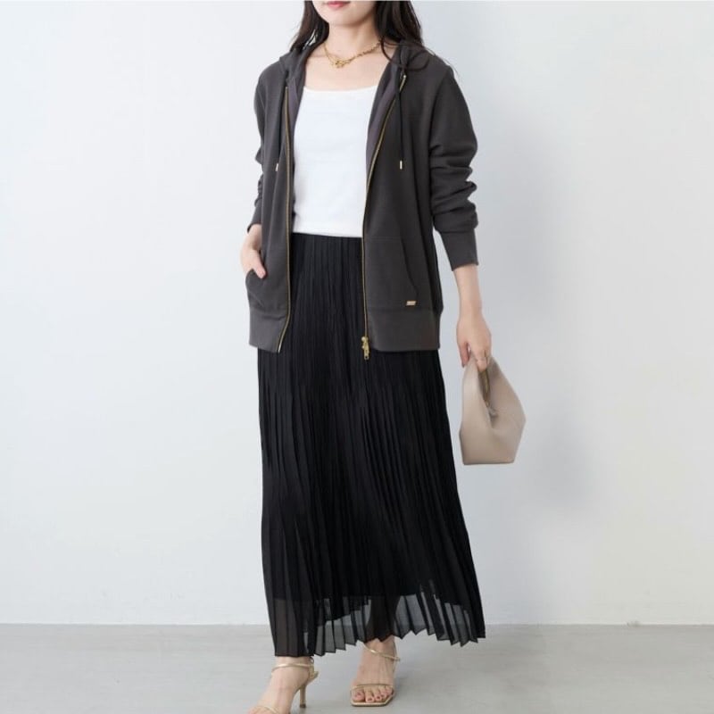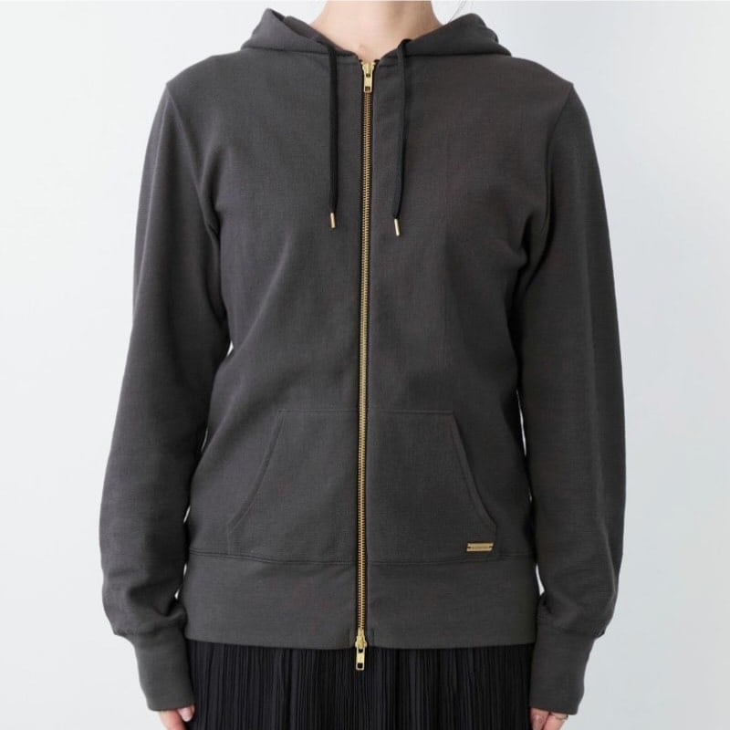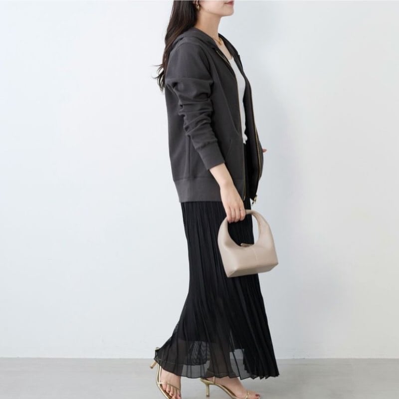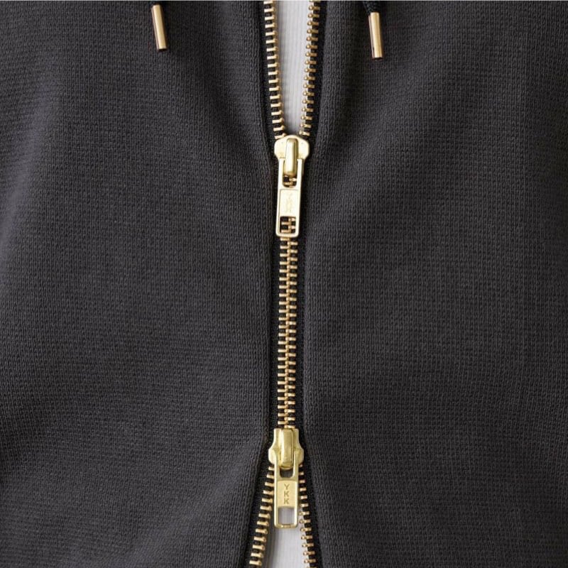 ファスナーカラーをゴールドにすることで、カジュアルなフーディーに上品な雰囲気をプラスしています。