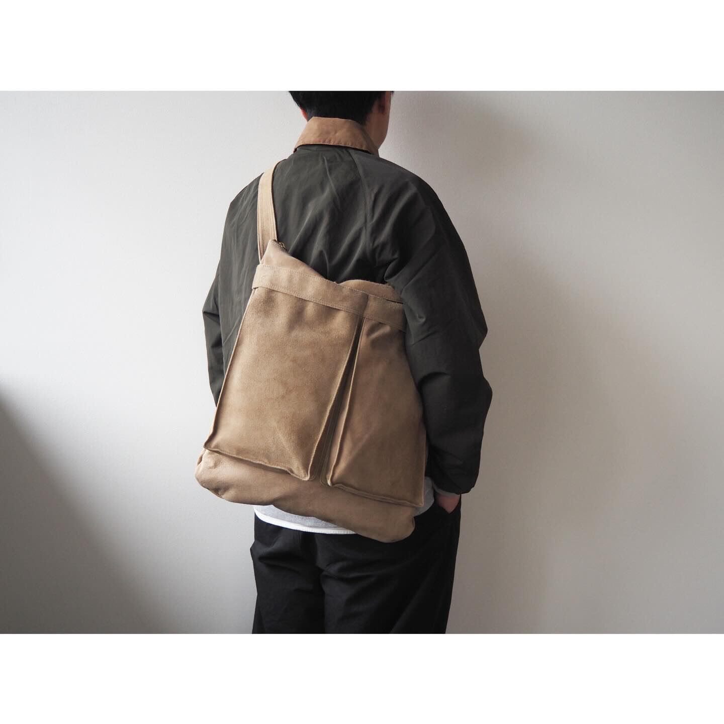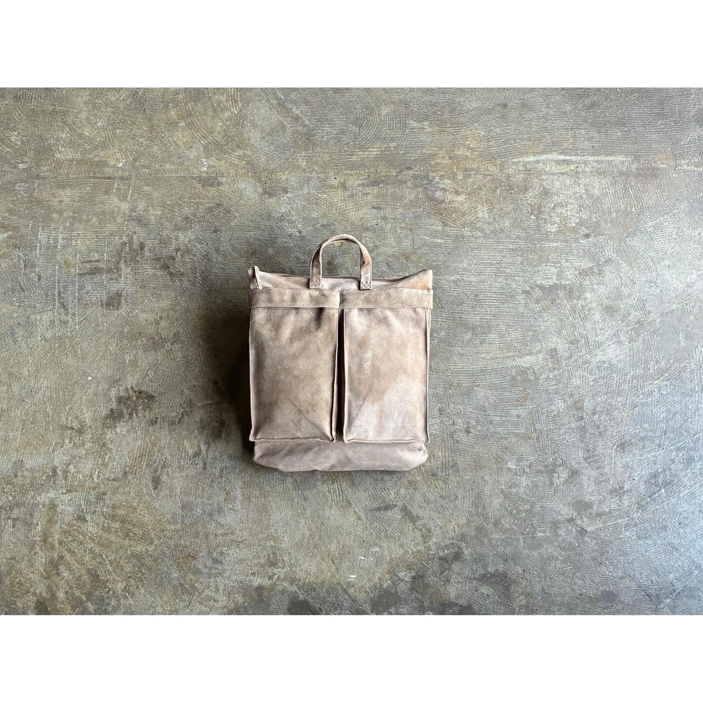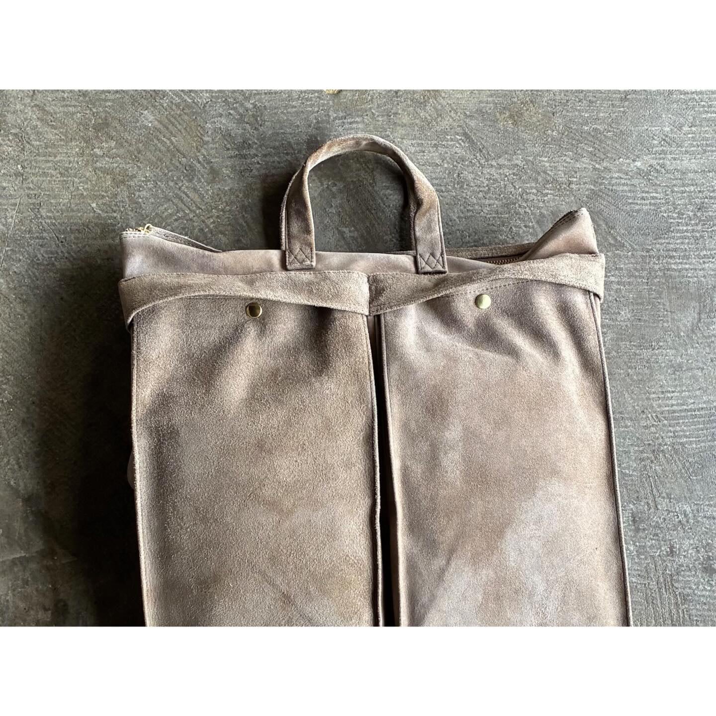 普遍的なヘルメットバッグのデザインを、"SLOW"らしい解釈と熟練の職人の手仕事によるホースハイドスエードで仕立てた『Horse Suede Helmet Bag』。