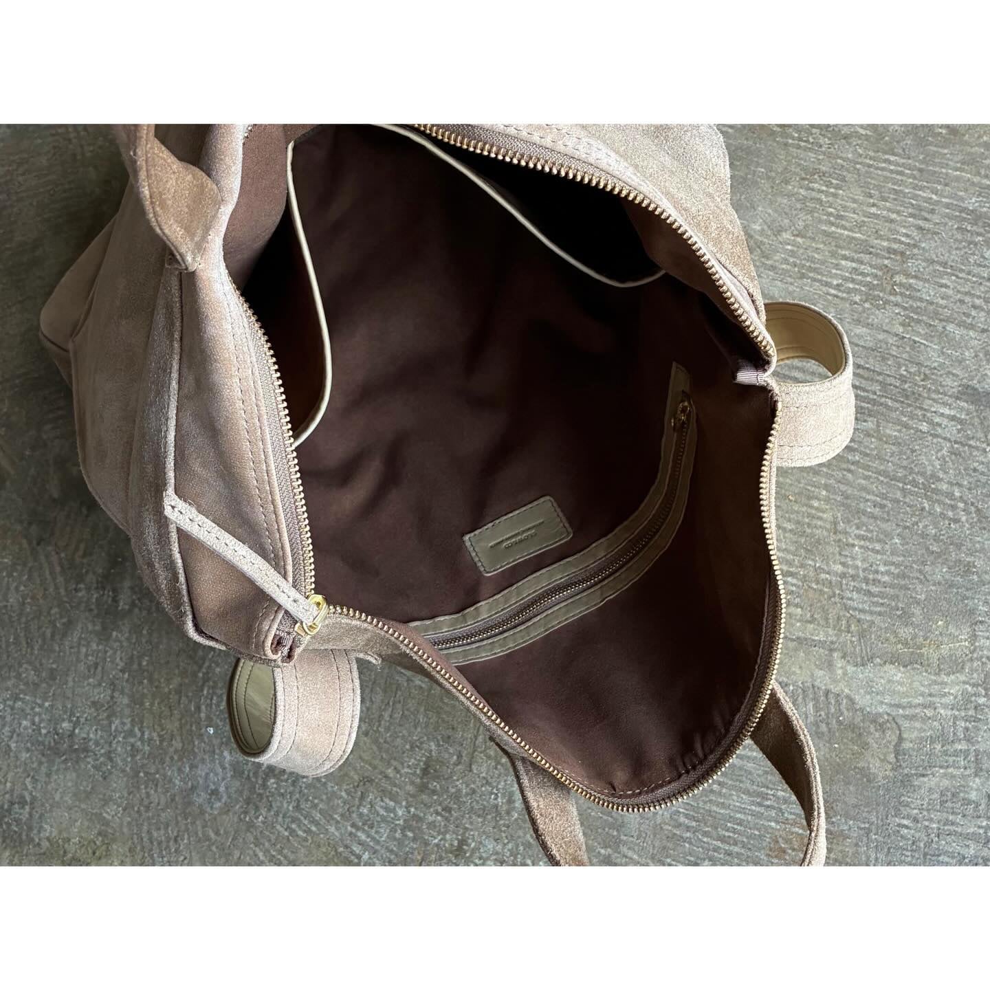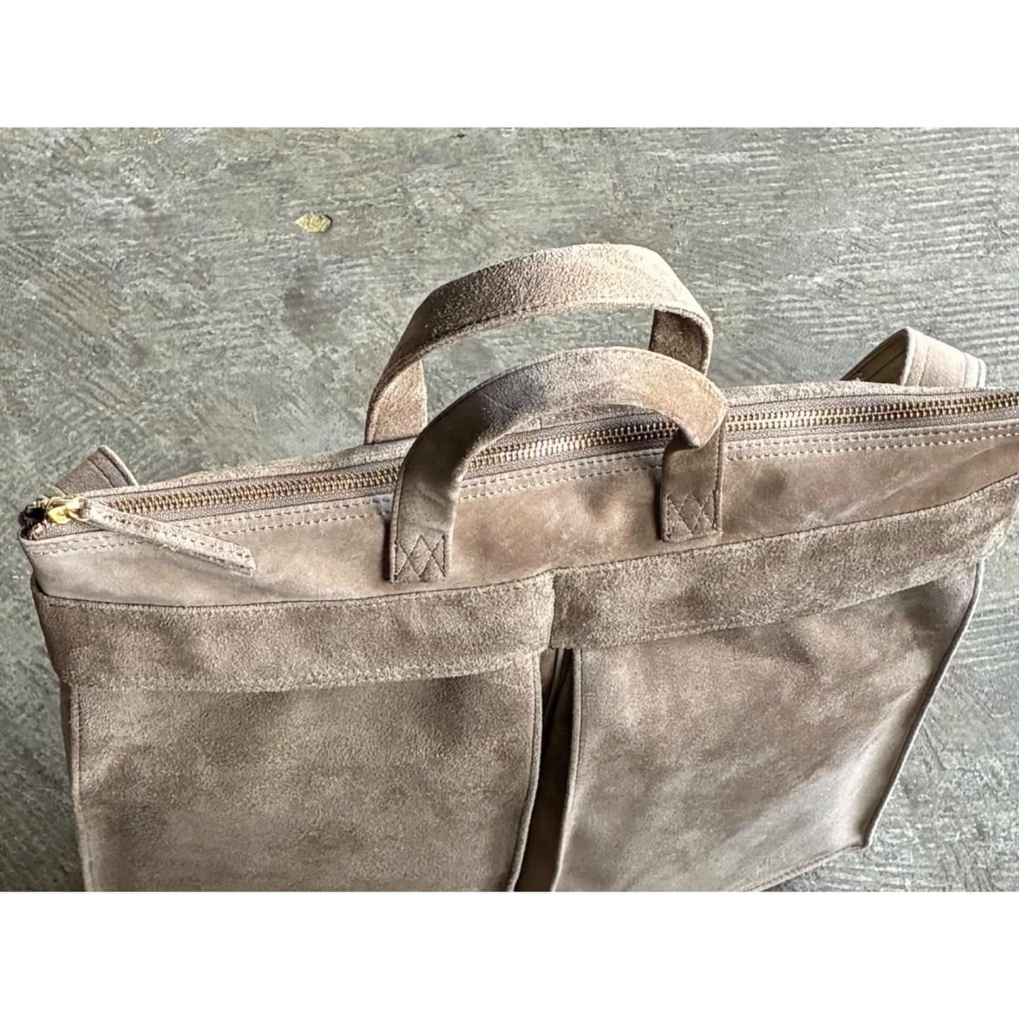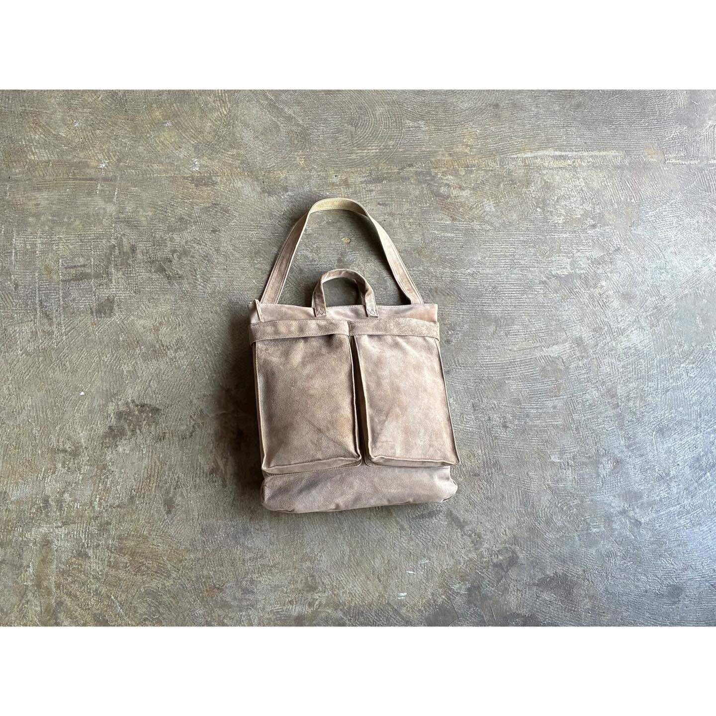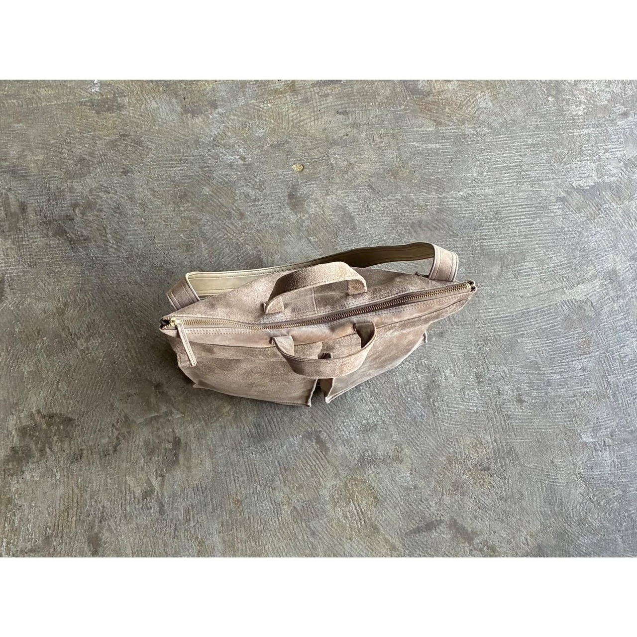 普遍的なヘルメットバッグのデザインを、"SLOW"らしい解釈と熟練の職人の手仕事によるホースハイドスエードで仕立てた『Horse Suede Helmet Bag』。
