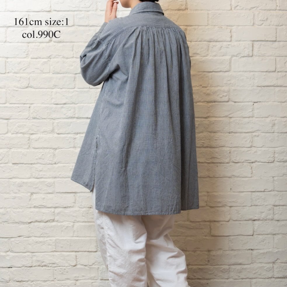 前身頃とバックヨークに施された繊細なギャザーが、裾に向かって美しいドレープを描き出し、空気を含んだような立体的なシルエットが着る人の個性を引き立てます。