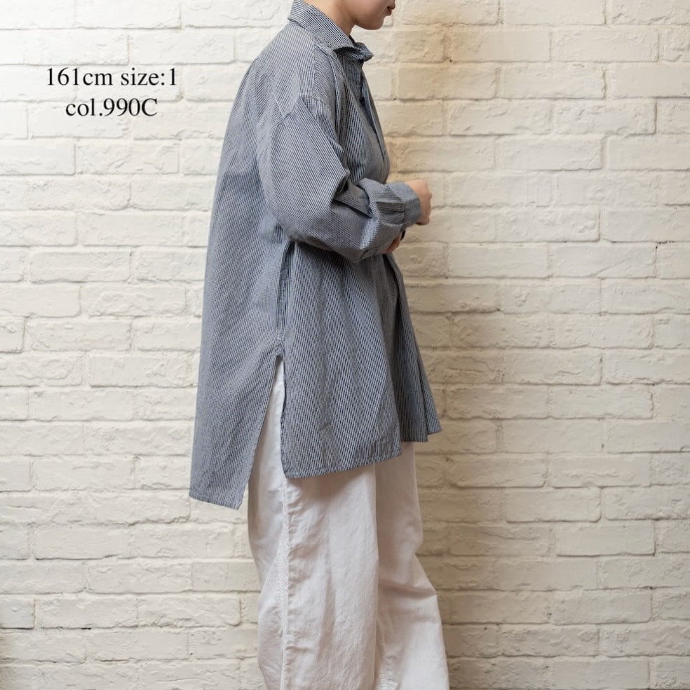 シャツのデザインは、長めの着丈とゆとりのあるサイズ感で、スモック感覚でサラッと着られるプルオーバーのシャツ。