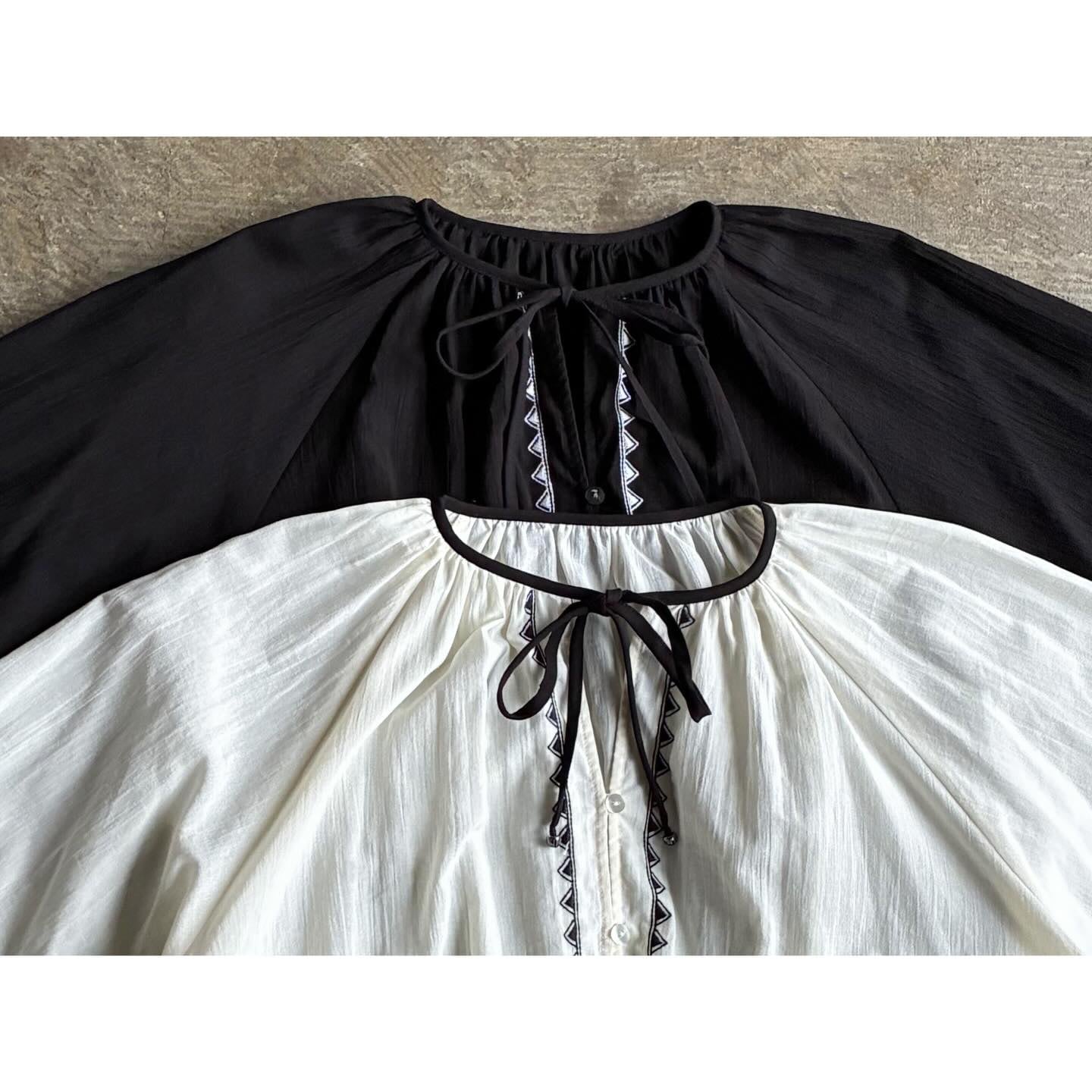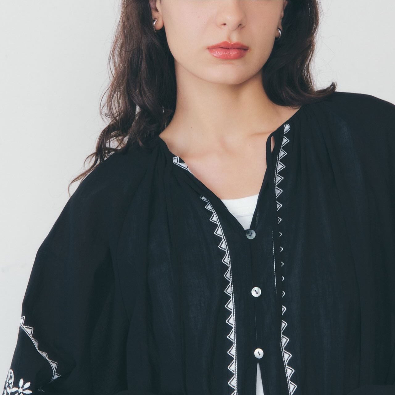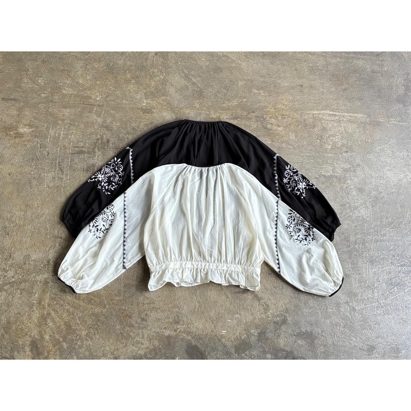 柔らかなシルエットと印象的な刺繍が目を惹くギャザーブラウス。