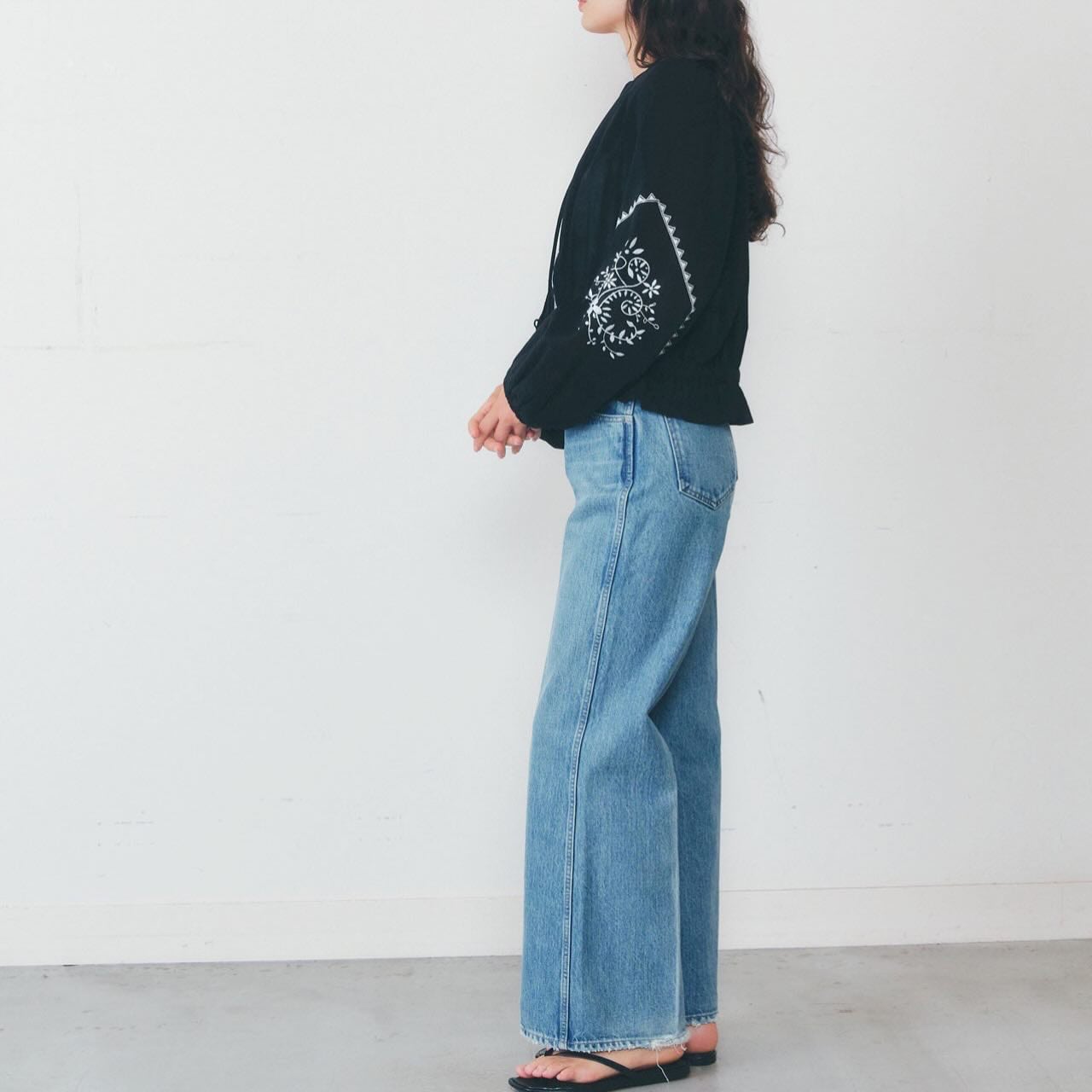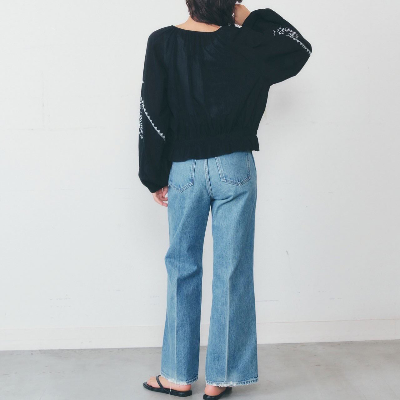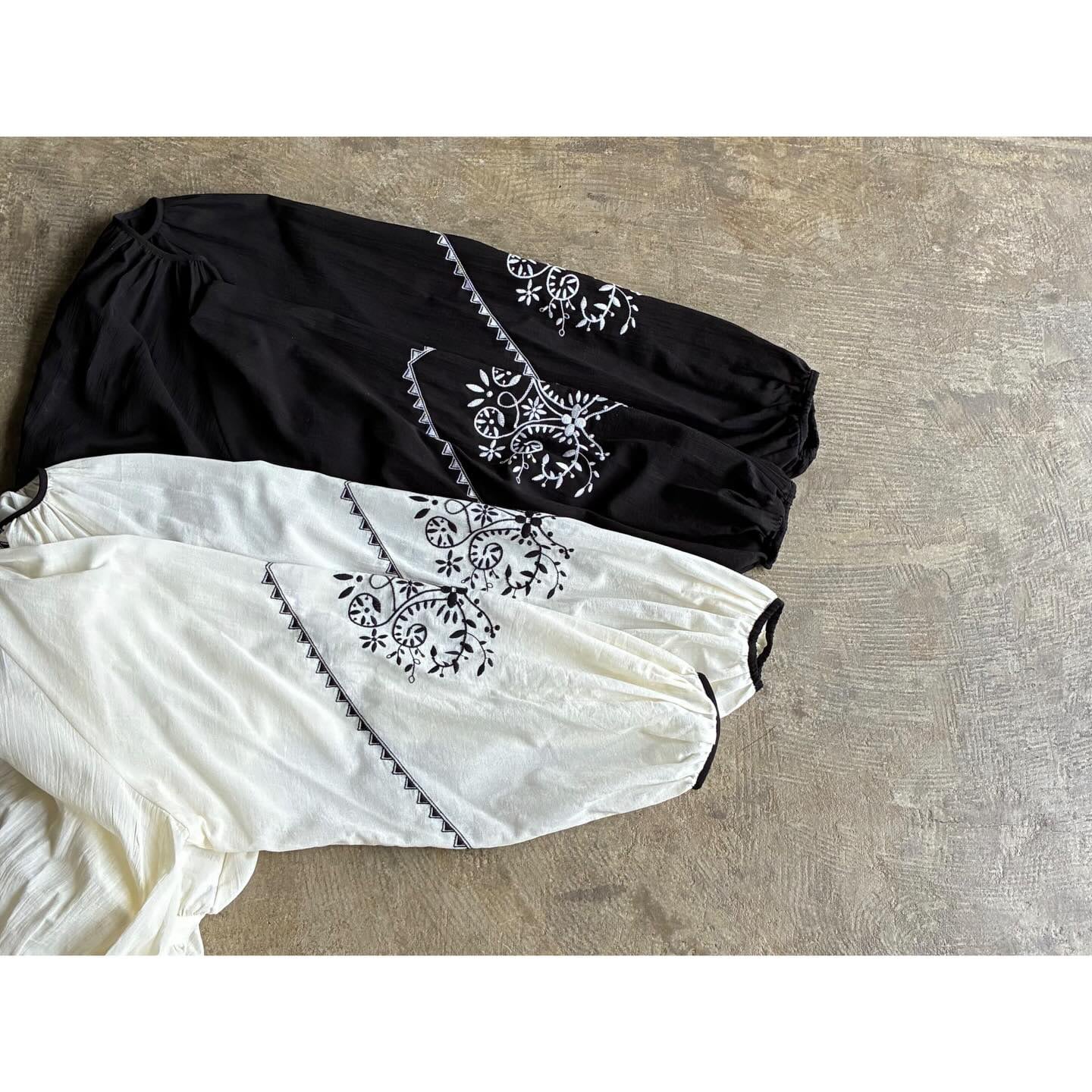 柔らかなシルエットと印象的な刺繍が目を惹くギャザーブラウス。