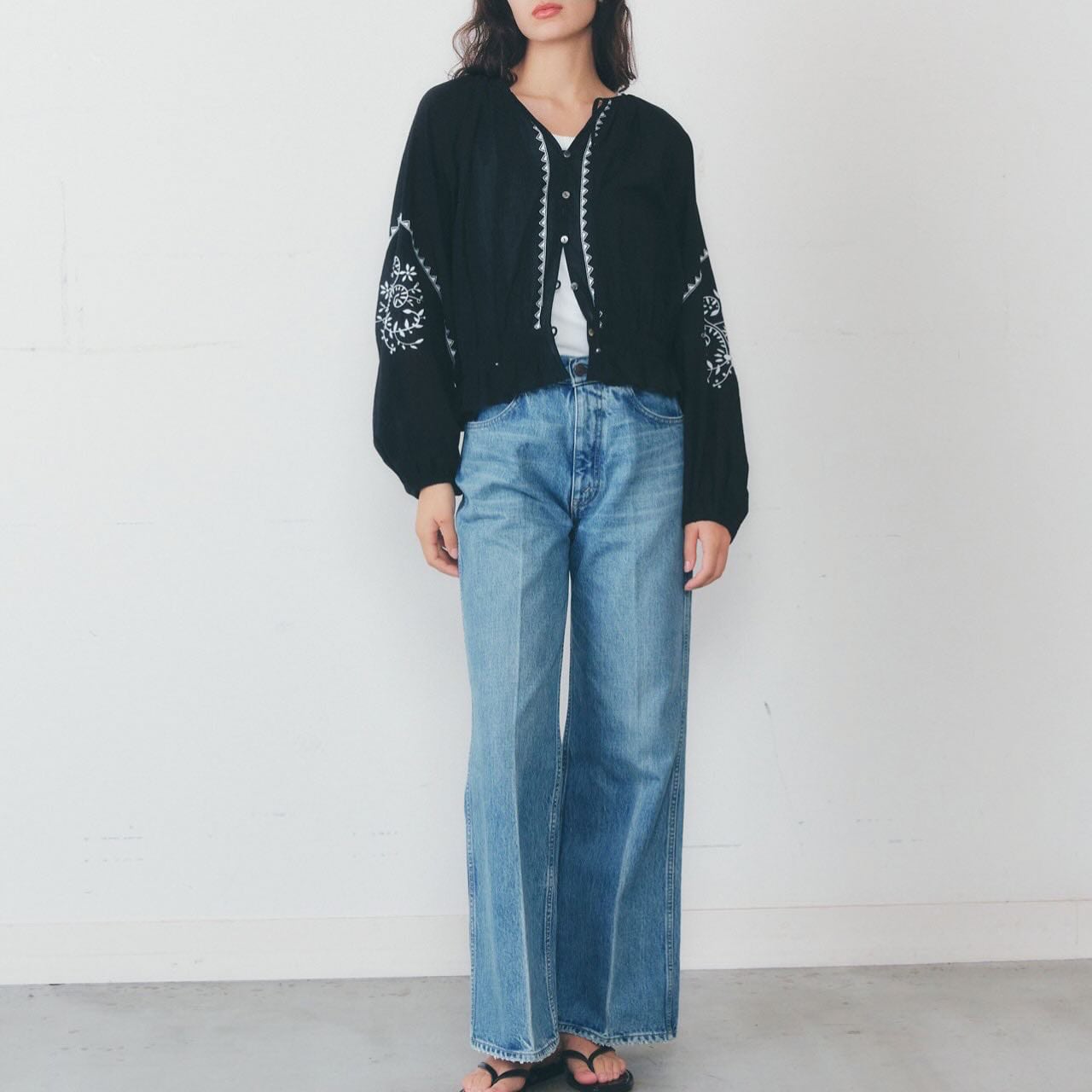 配色刺繍がほどよいコントラストを生み、甘くなりすぎず凛とした表情に。