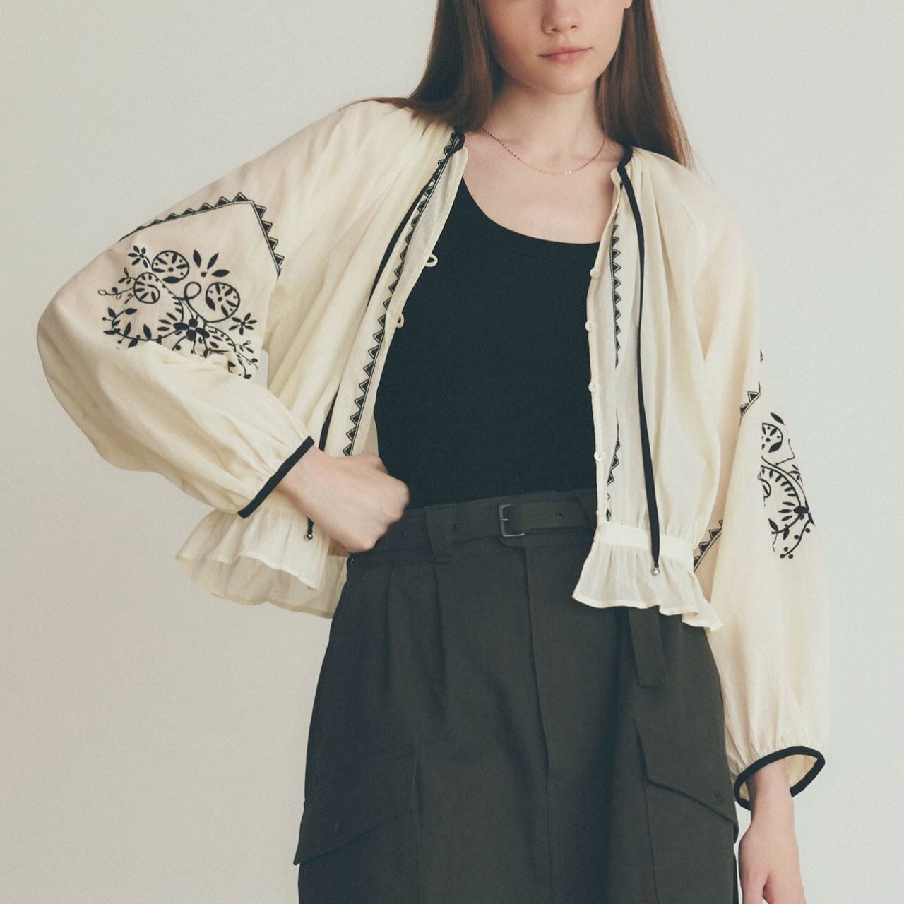 ブラウスのデザインは、クロアチアのフォークロアを思わせる、どこか温もりを感じるクラフト感のあるデザイン。