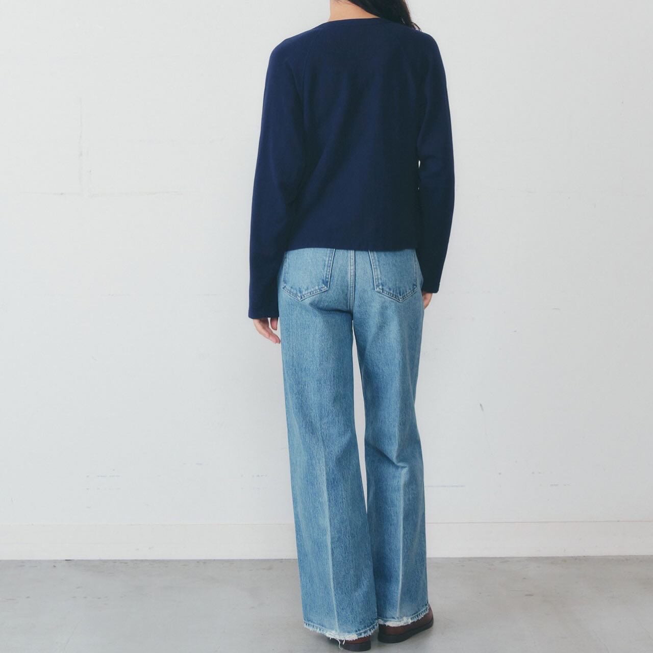 デザインは、クルーネックにラグランスリーブを採用した、ミニマルなカーディガン。