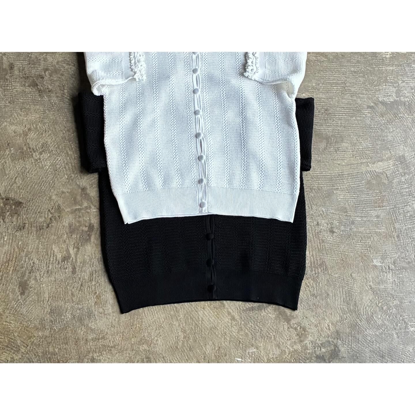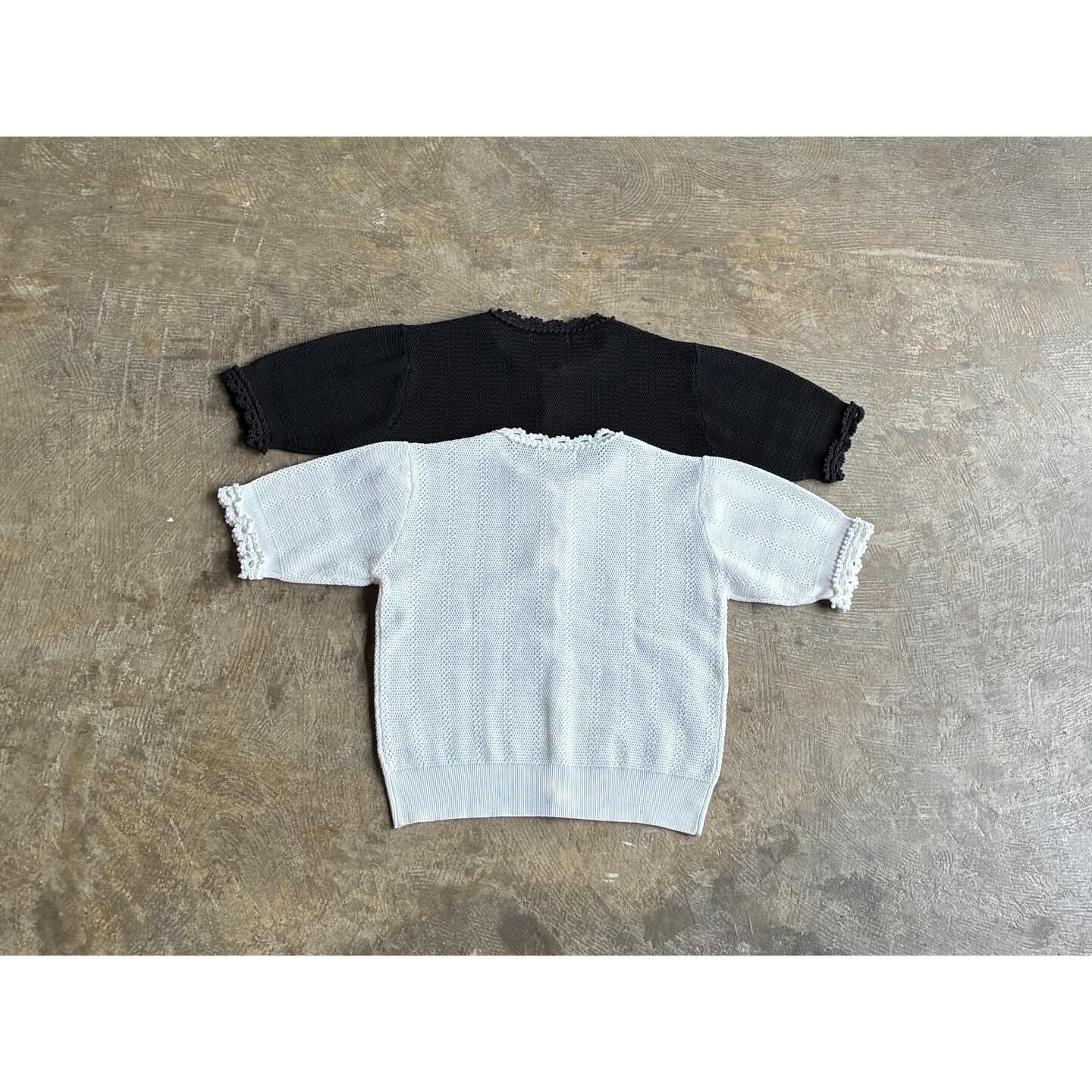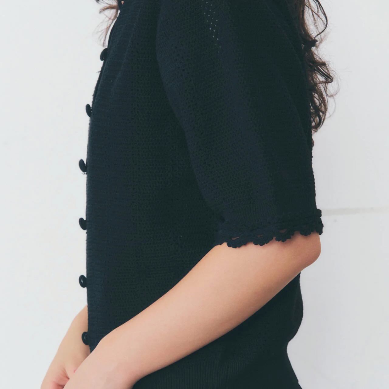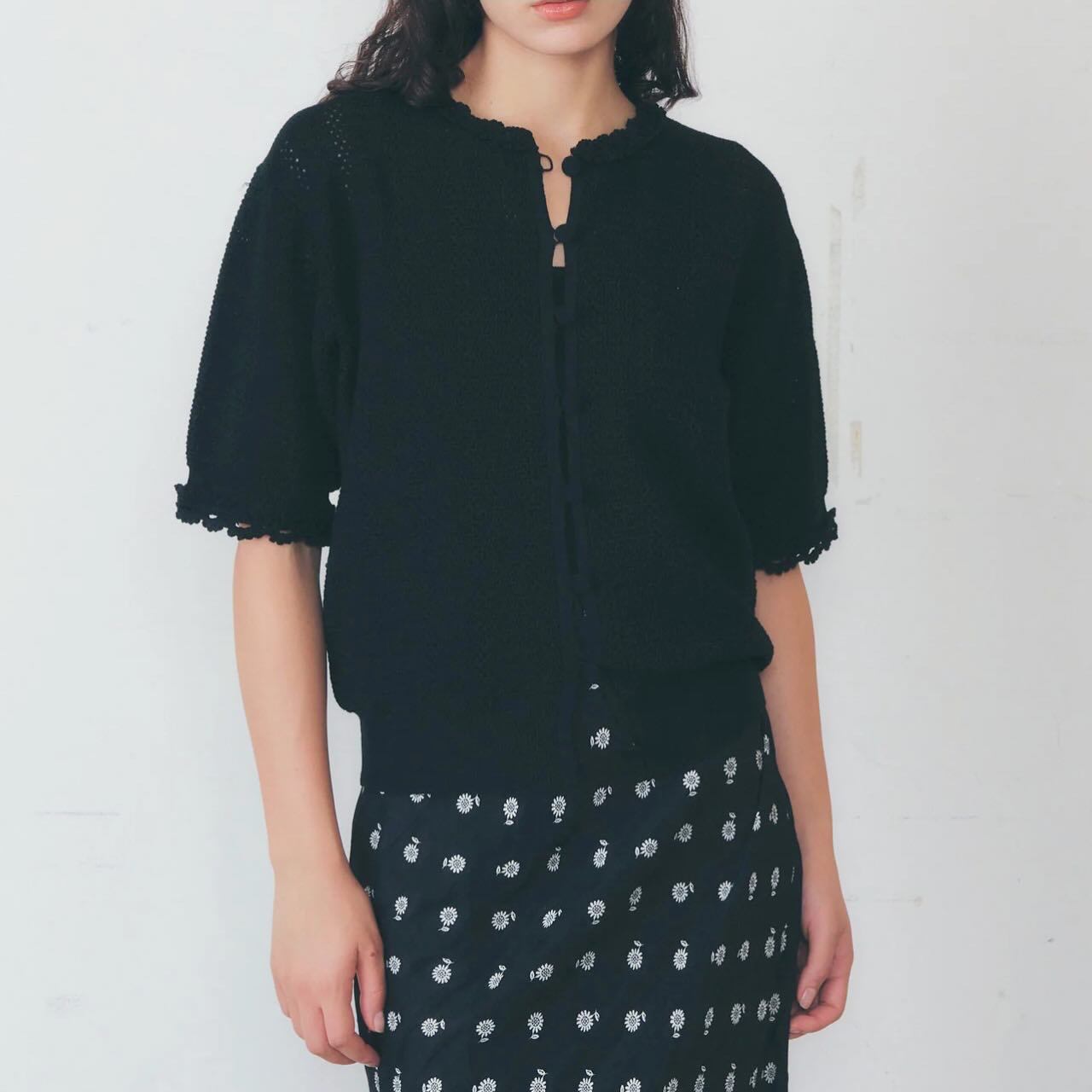 デザインは、透け感のあるレース編みの半袖ニットカーディガン。