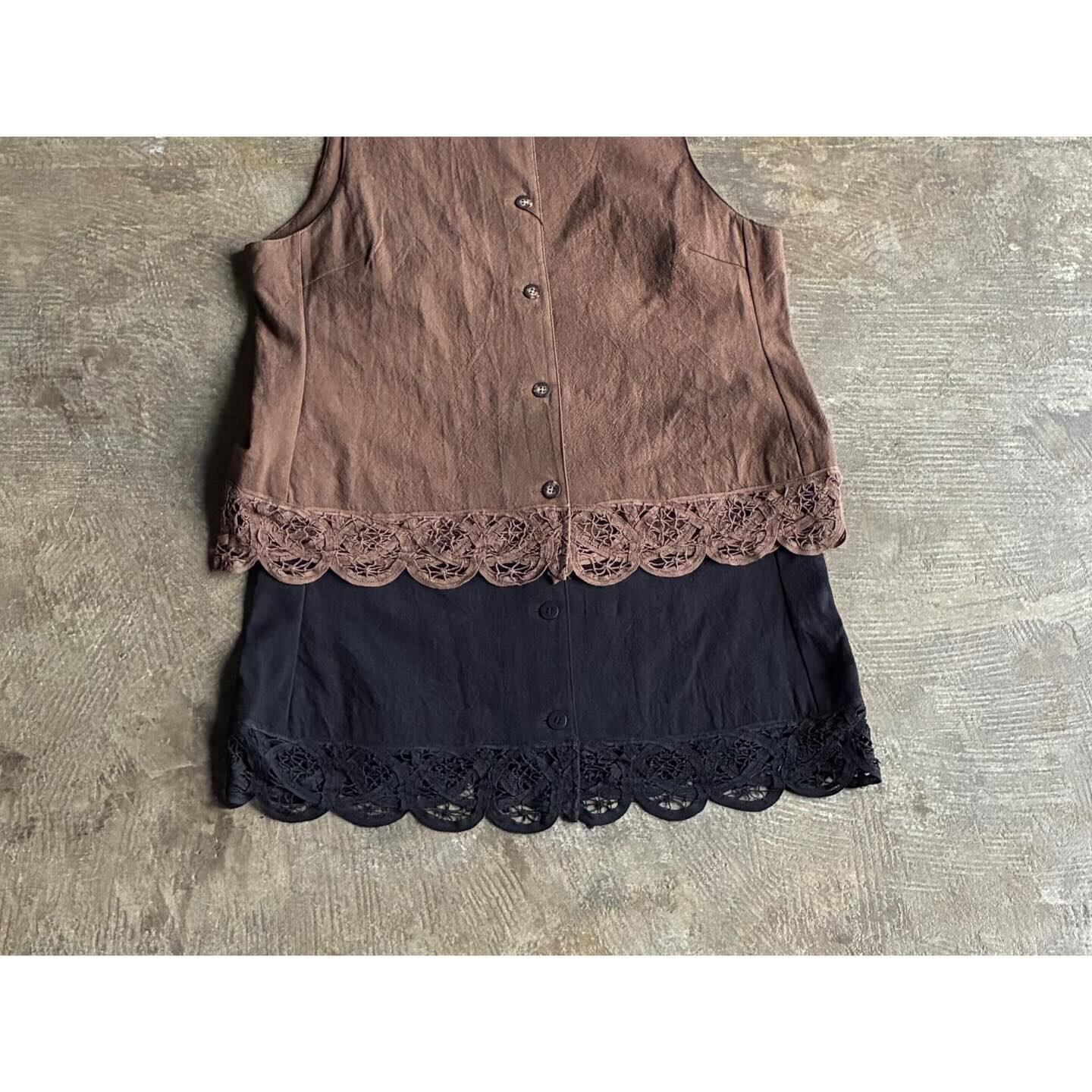 華やかなバテンレースを裾にあしらったジレアイテム。