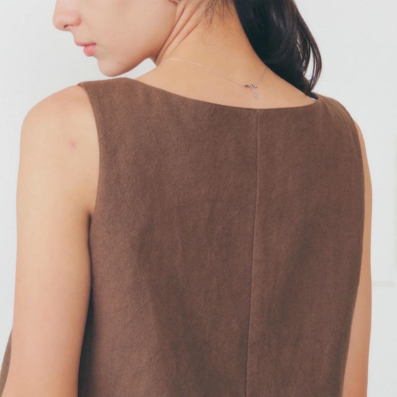 デザインは、首元をすっきりと見せるボートネックのジレタイプ。