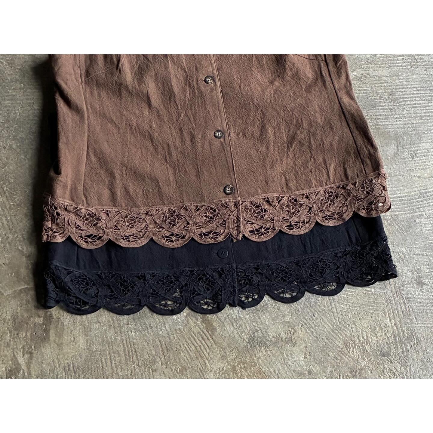 裾にあしらわれたバテンレースがさりげないアクセントとなり、コットンリネンのナチュラルな風合いと相まって、バテンレースならではの手仕事の温もりと上品さを感じさせます。