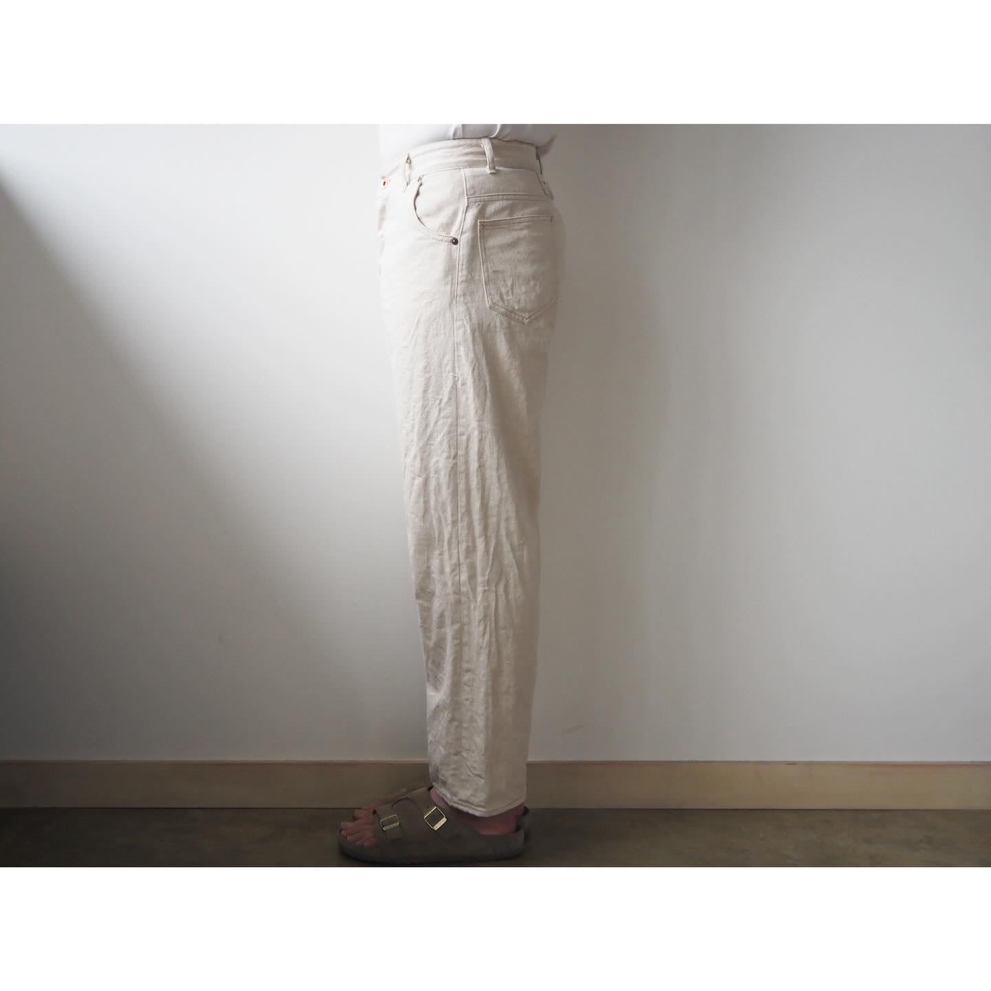 生成りデニム特有の、チリやカスが混ざった粗野な表情が、ほどよくラフな雰囲気を演出します。
