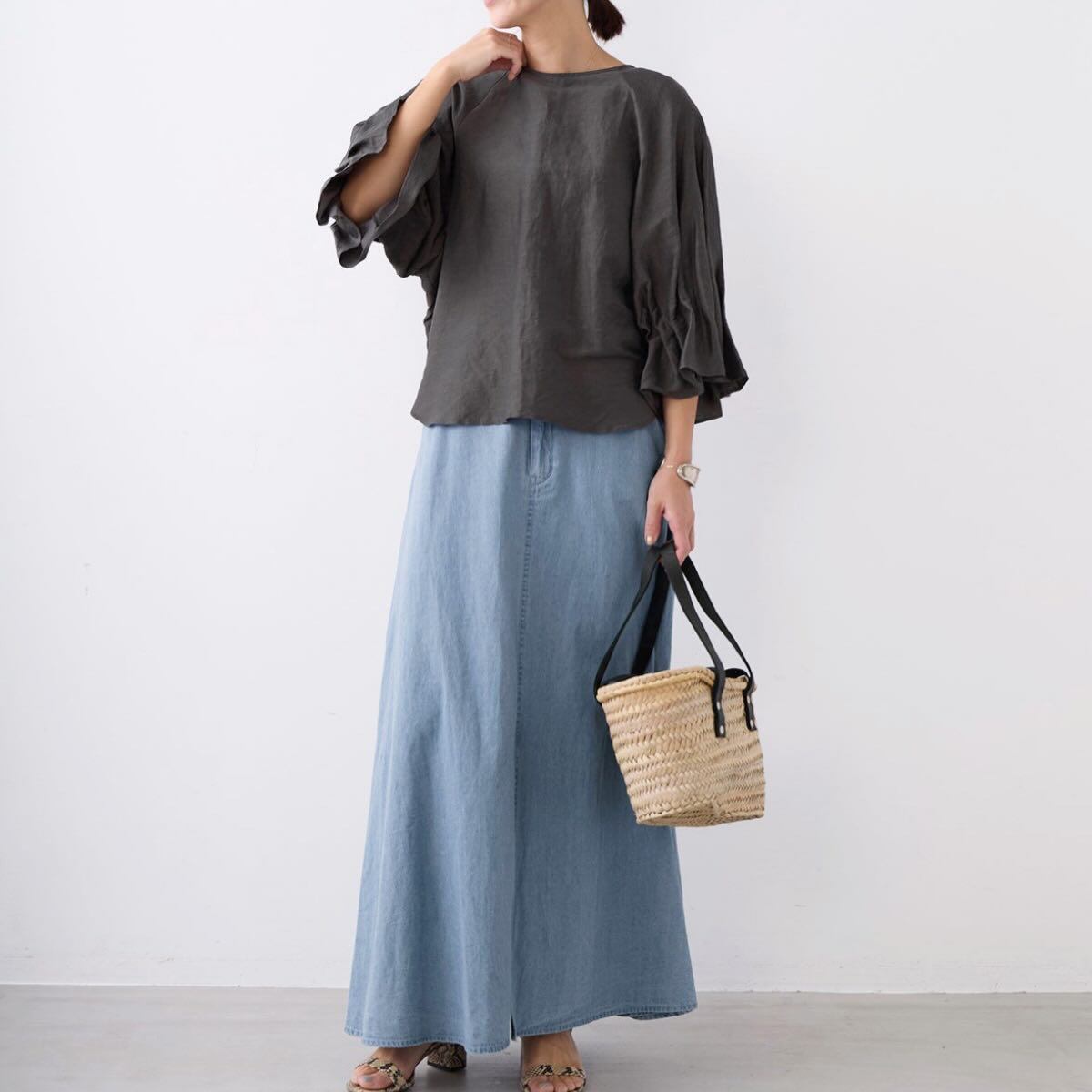ブラウスの持つフェミニンさに、デニムのラフなニュアンスを掛け合わせることで、気張りすぎない大人のサマースタイルが完成します。