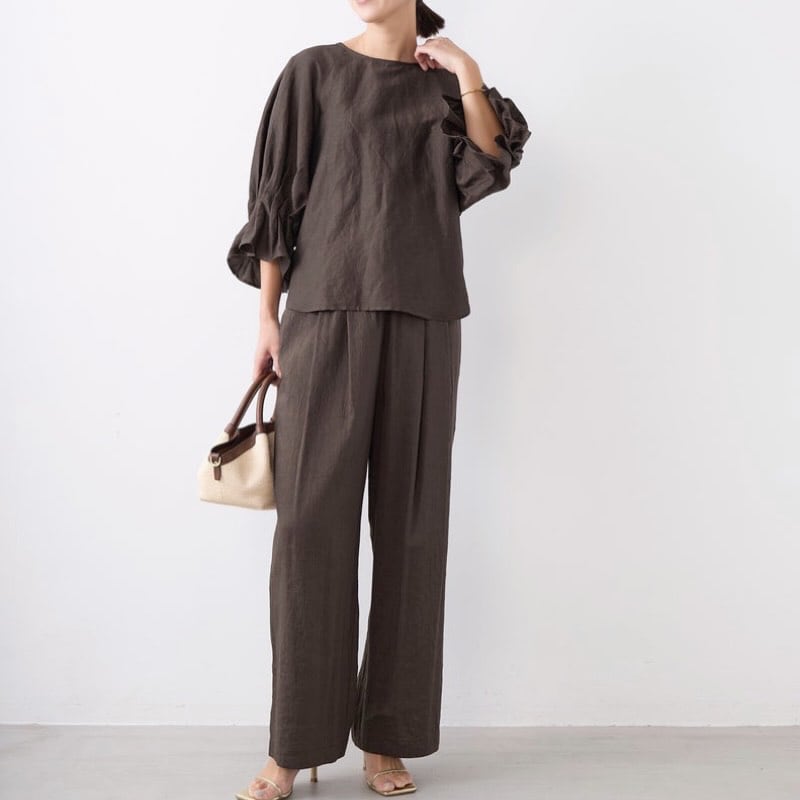 動きに合わせてやわらかく揺れる袖の表情が、装いにさりげないニュアンスを添えてくれます。