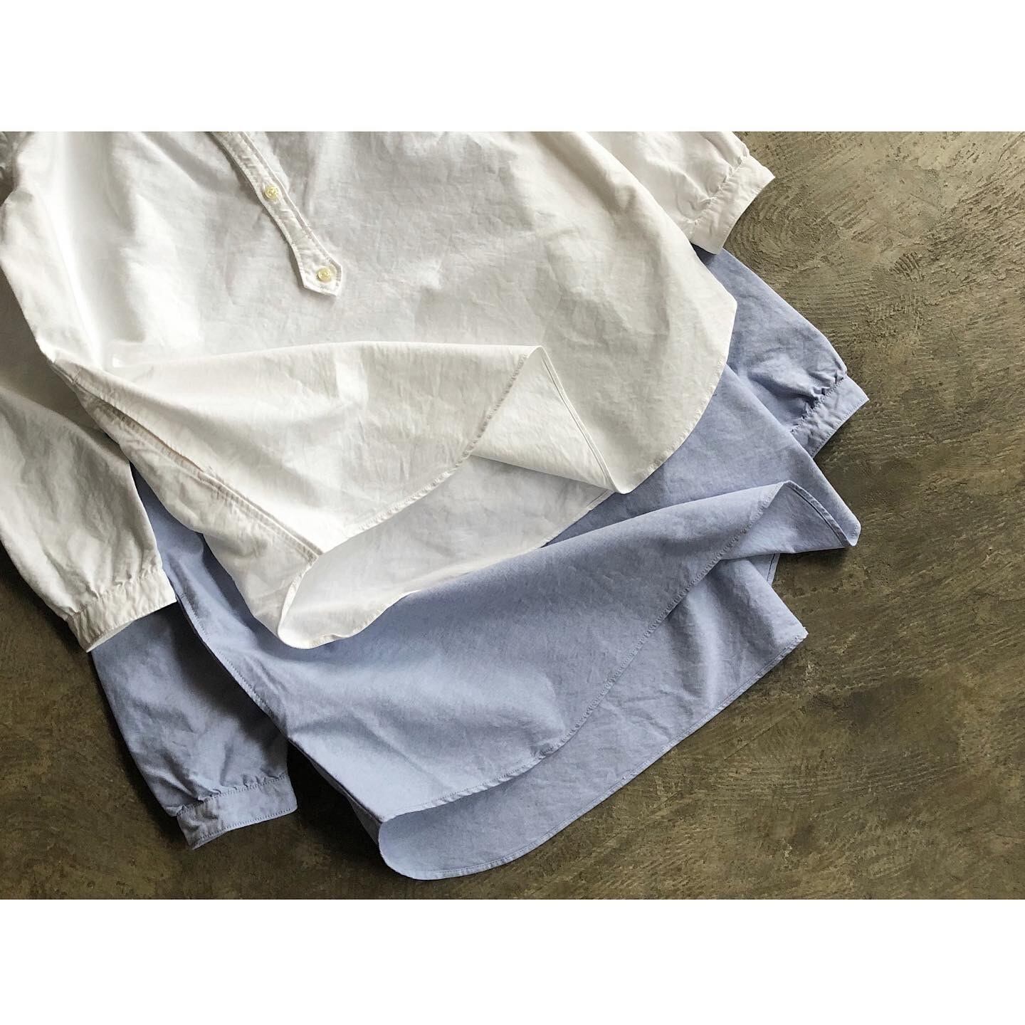 コットン100%のオックスフォード生地でトラッド感のある雰囲気に。そこに小さなラウンドカラーと首元のギャザーで、柔らかい女性らしさをプラスしたデザイン。
