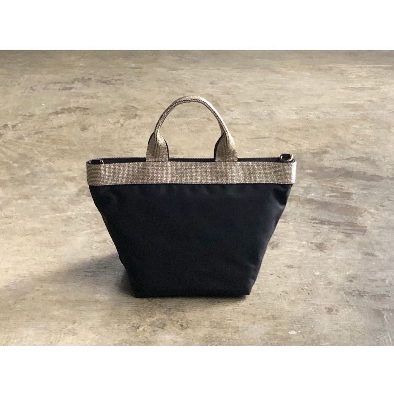 ムラ感と凹凸のあるナイロン生地は丈夫で上品なカジュアル感があり、ゴールドのテープハンドルが女性らしい雰囲気です。