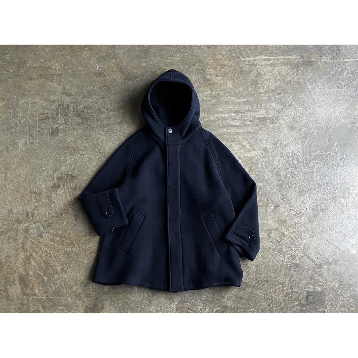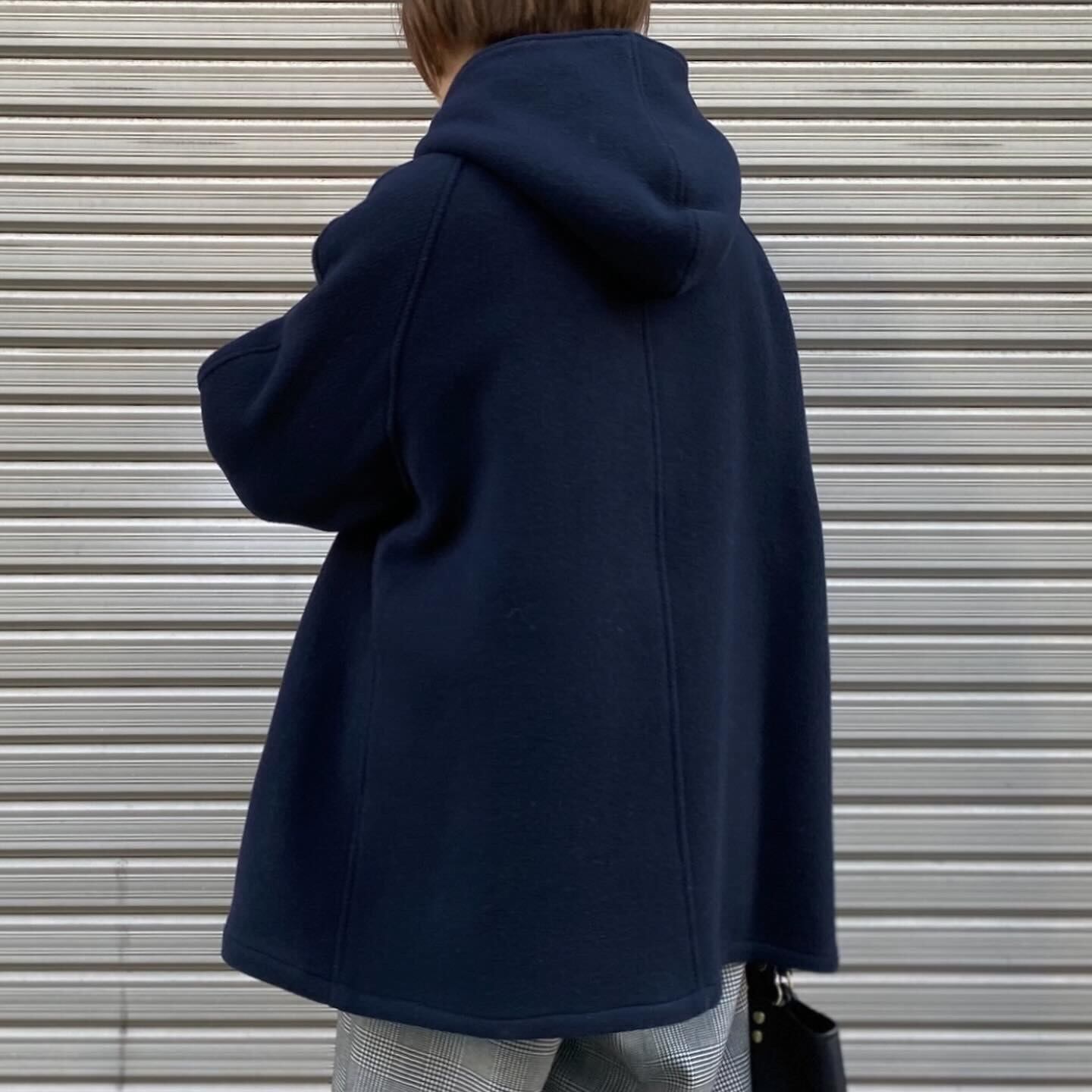 腰回りが隠れるくらいの着丈のショートコートは、落ち感のある綺麗なAラインシルエットで、ボリュームのあるフードが目を引きます。