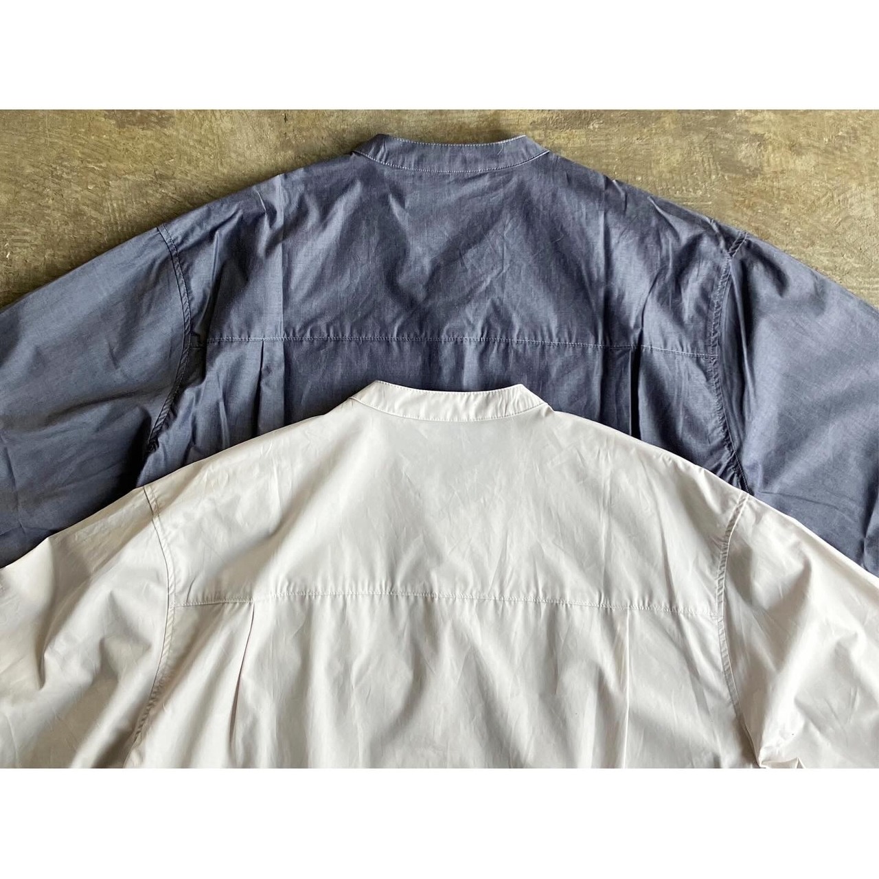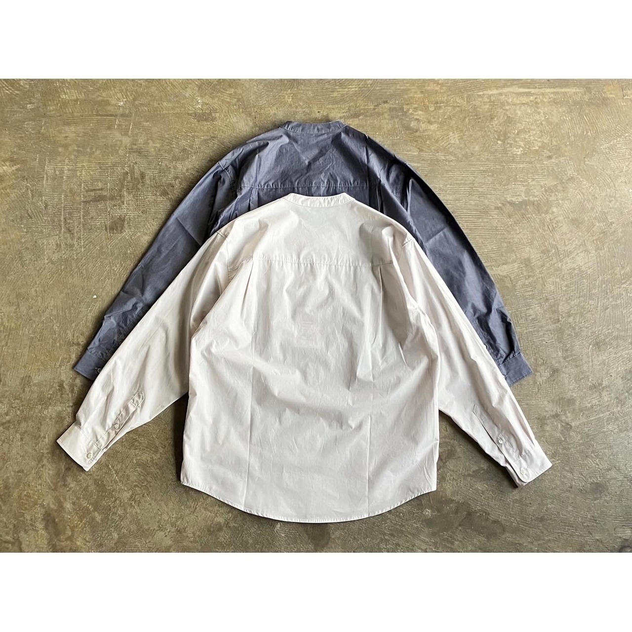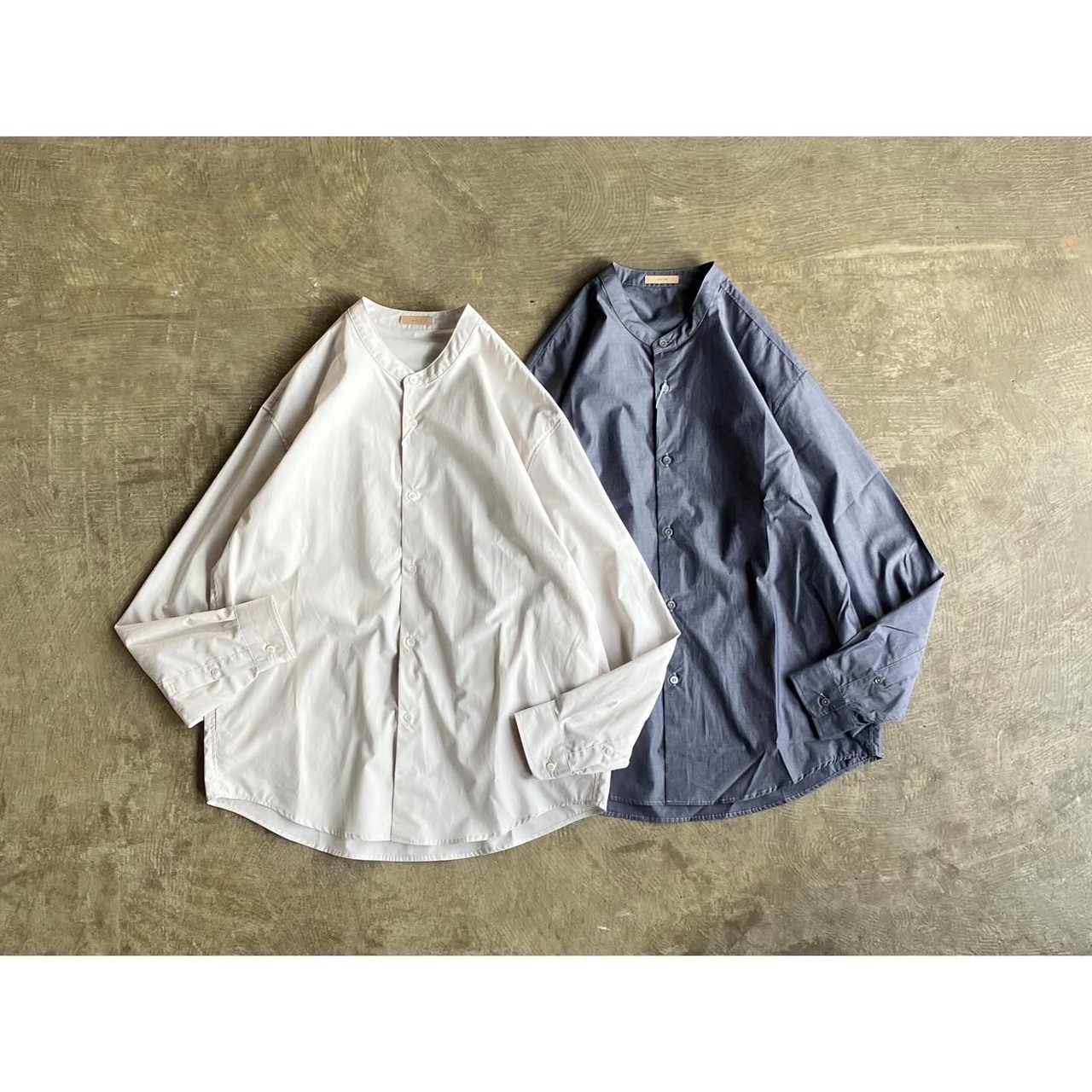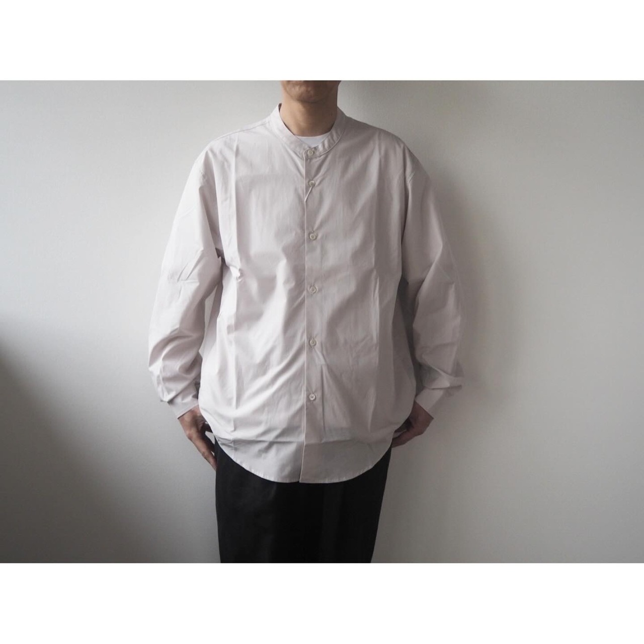 スッキリとした印象と清潔感を醸し出すバンドカラーの仕立ては、カジュアルながら少し綺麗目な雰囲気を演出してくれます。