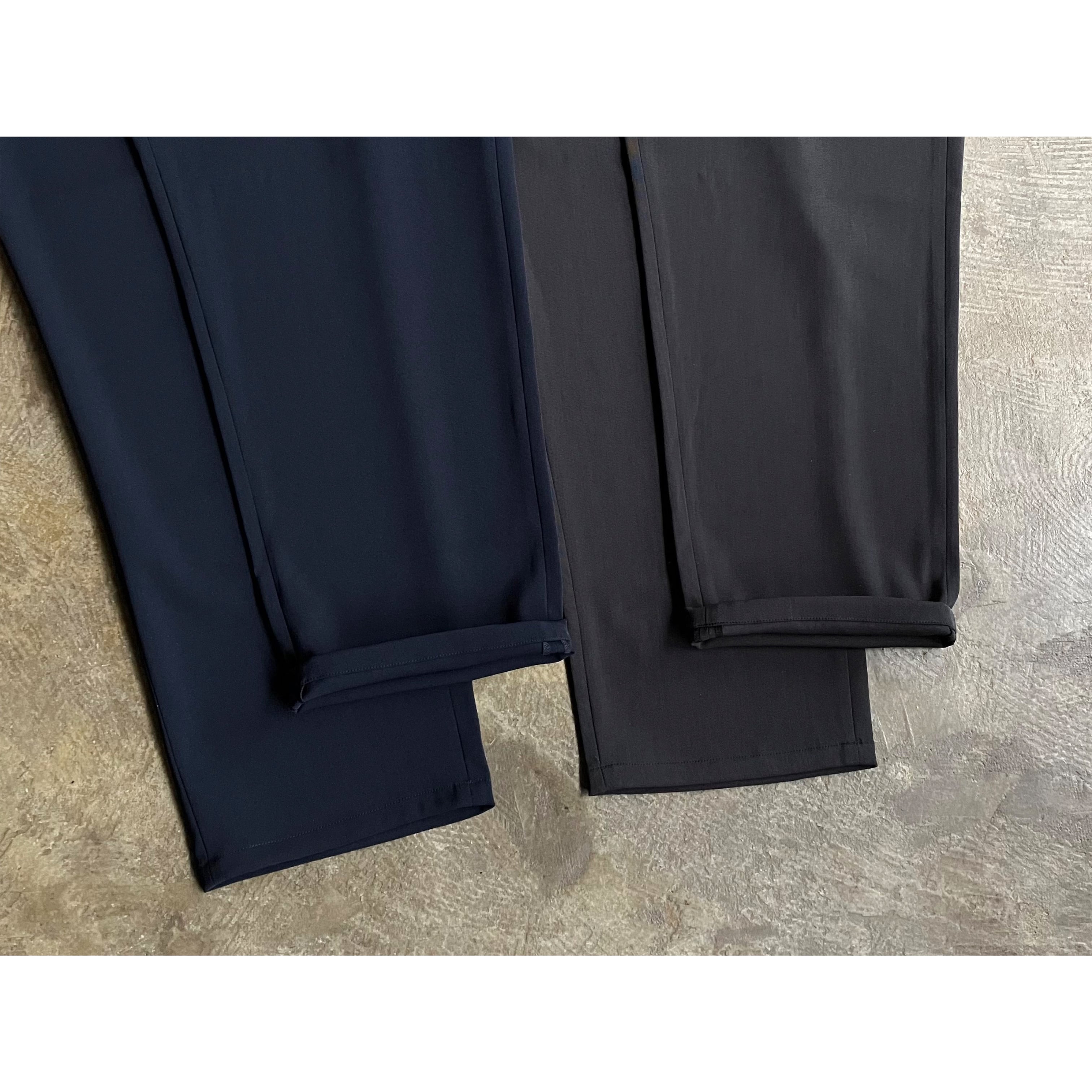 使用される生地には、晩夏から初冬、春先に至るまで長い期間で穿いて頂くことのできる、しなやかな落ち感が綺麗な、微光沢のポリエステルツイルジャージー生地を使用。