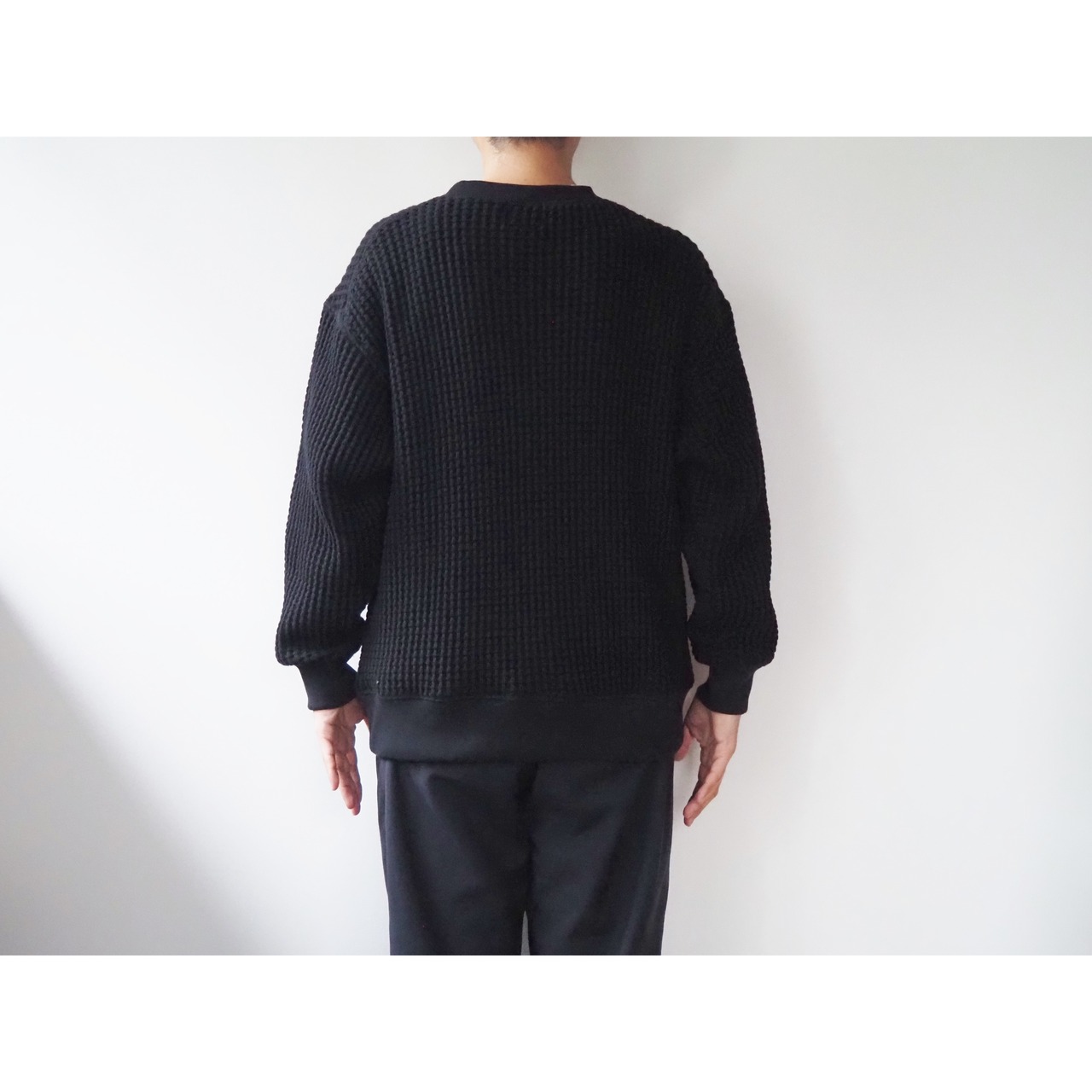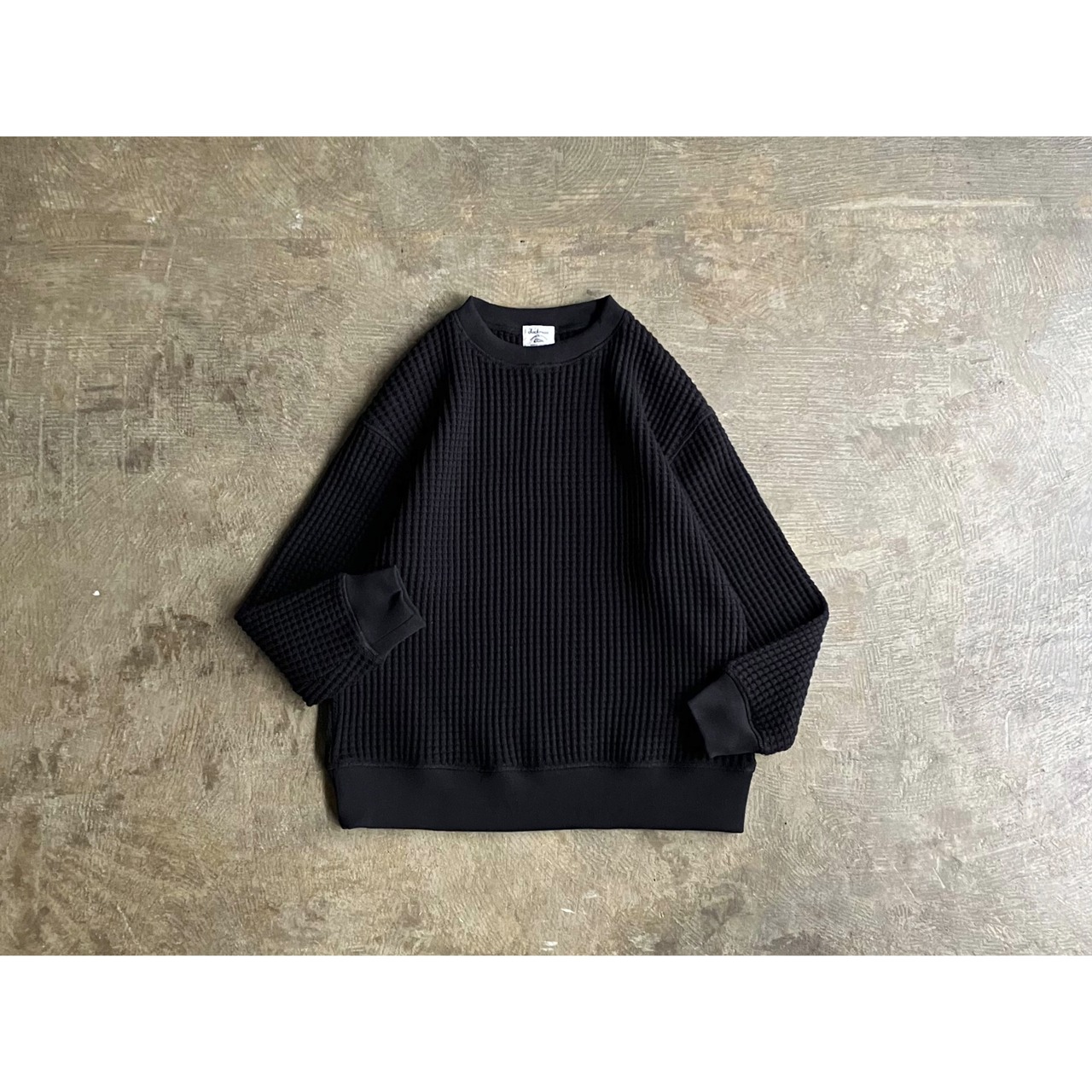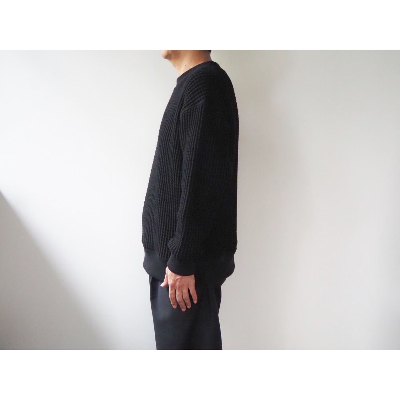 希少な5ゲージのジャカード編み機を使い甘く撚った綿糸を引き揃えて、ワッフル編みしたビッグビッグワッフルクルーネックシャツ。