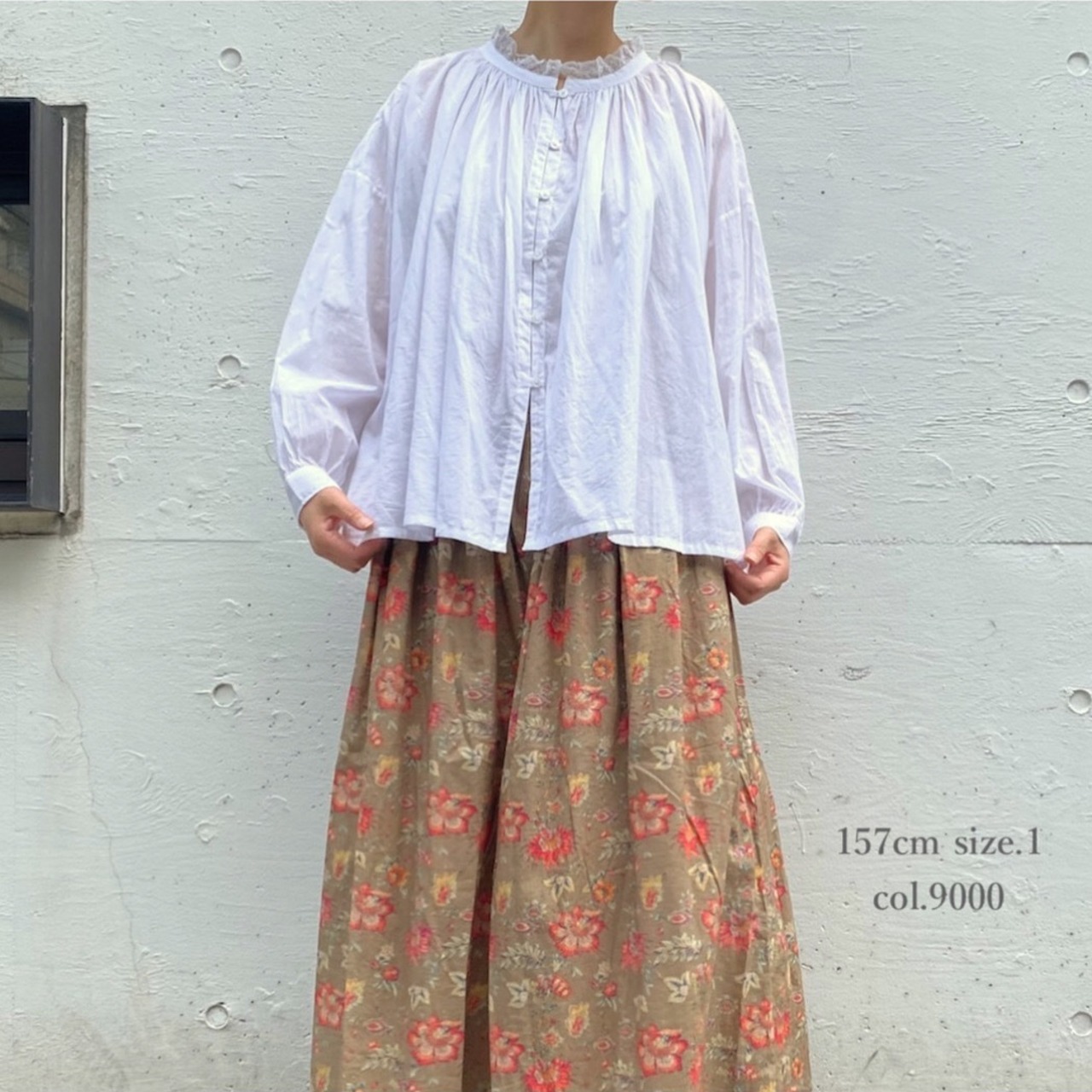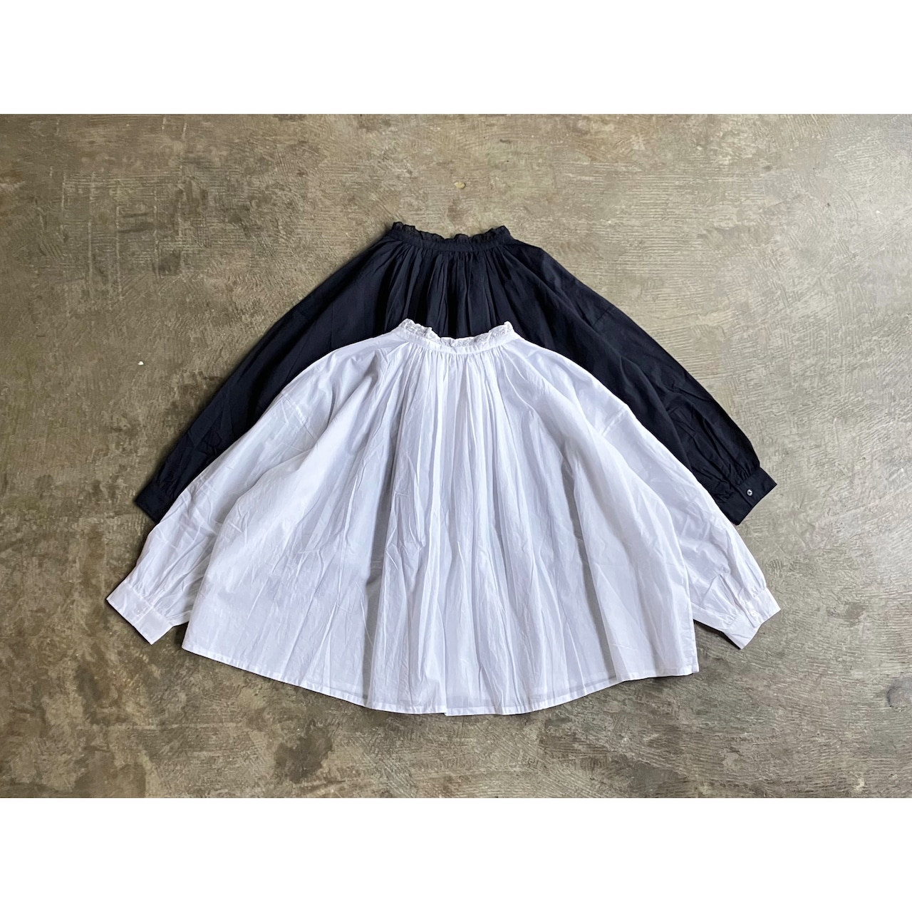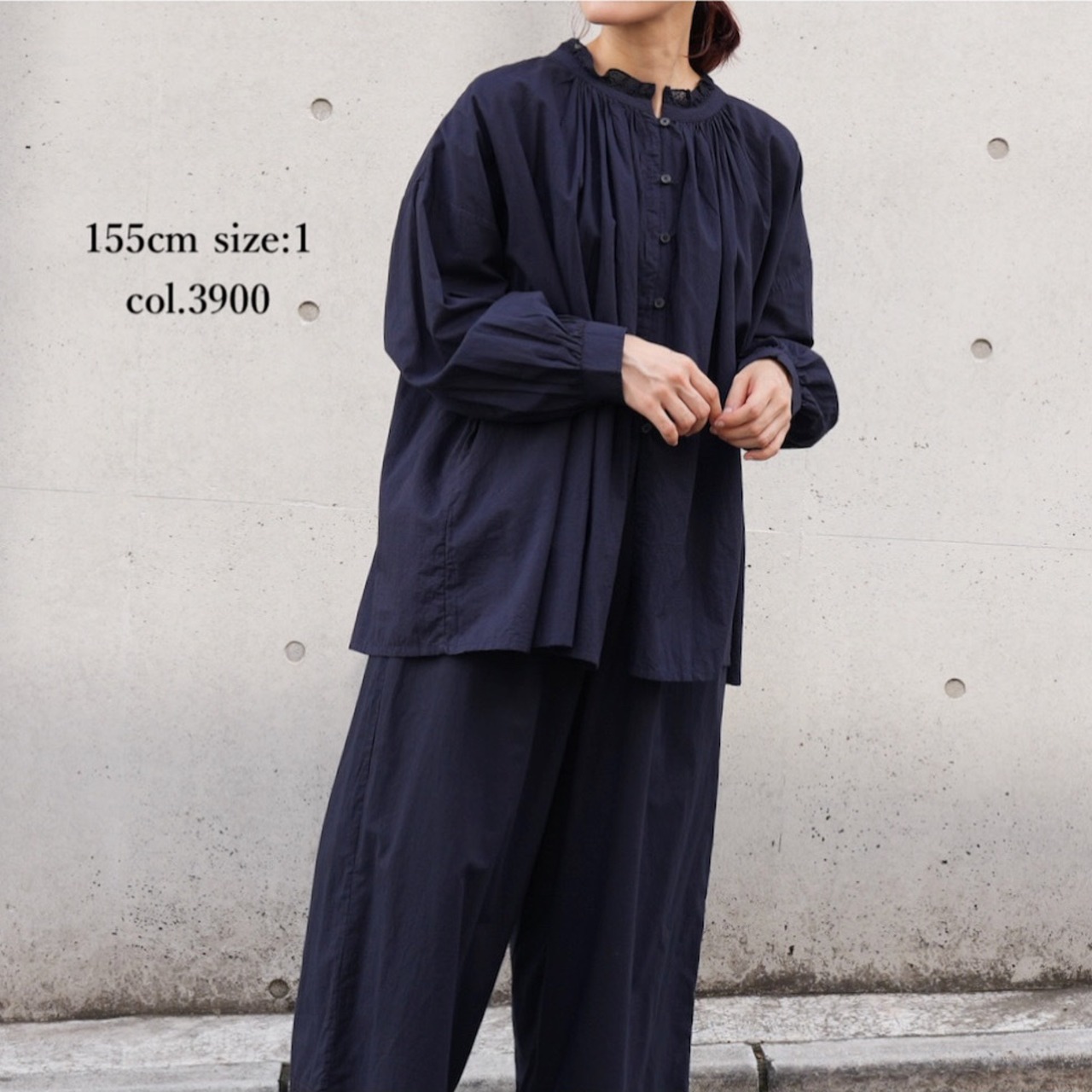 前後ネックラインの細かなギャザー使いで、空気を含むふんわりとしたシルエットが楽しめる1着です。