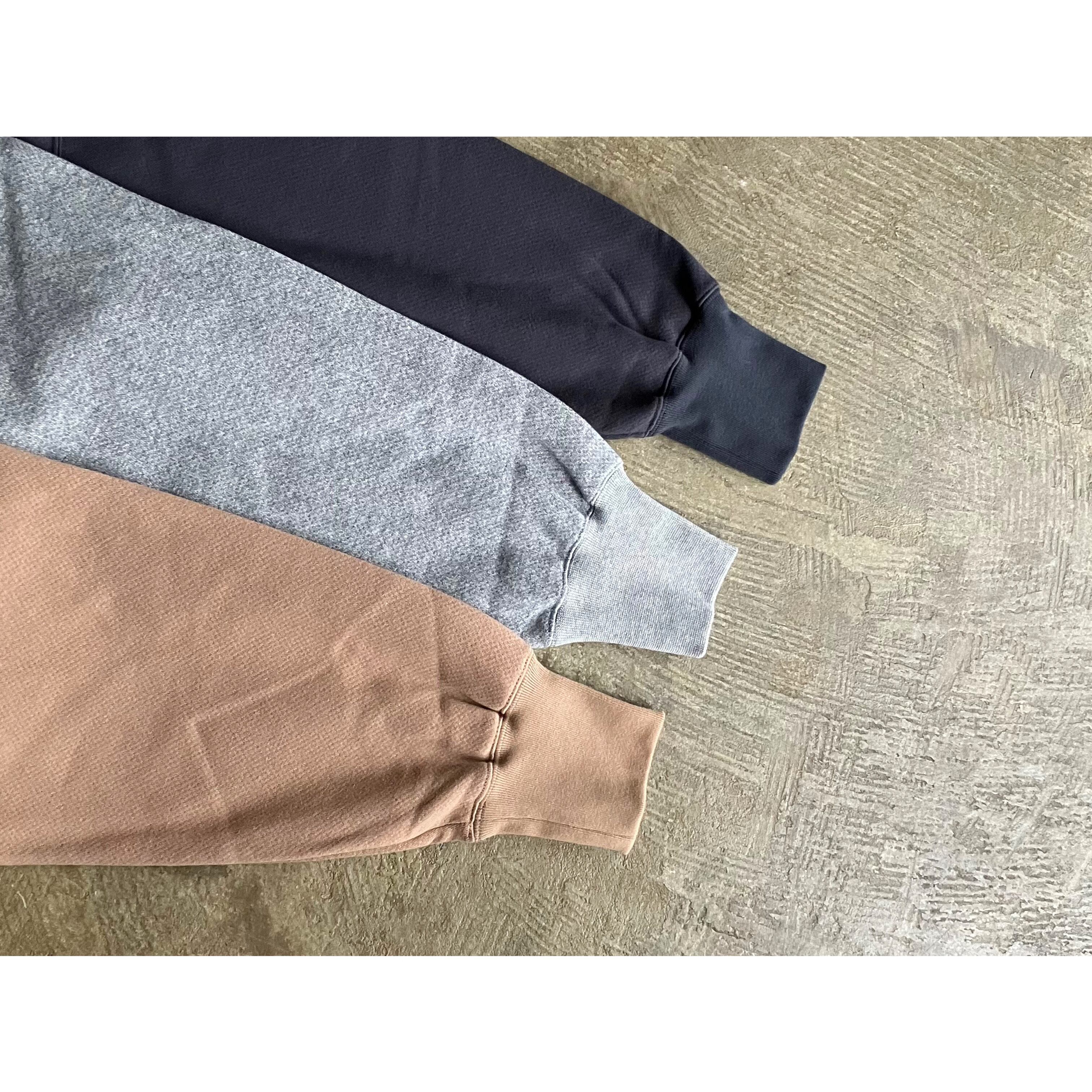 裏糸をアクリルにし、起毛させることで、裏起毛のスウェットながら軽くボリュームのある生地感に。